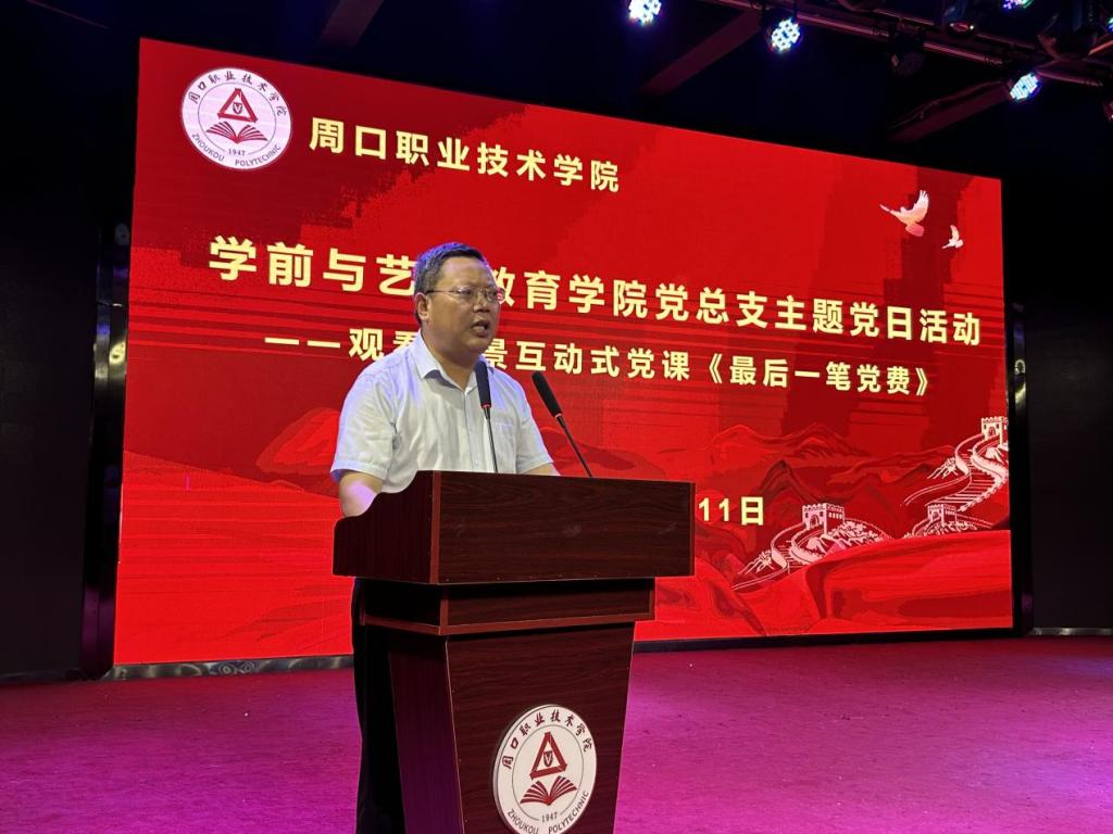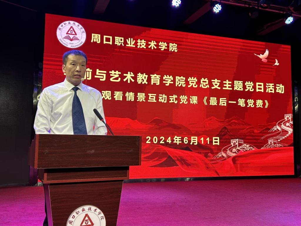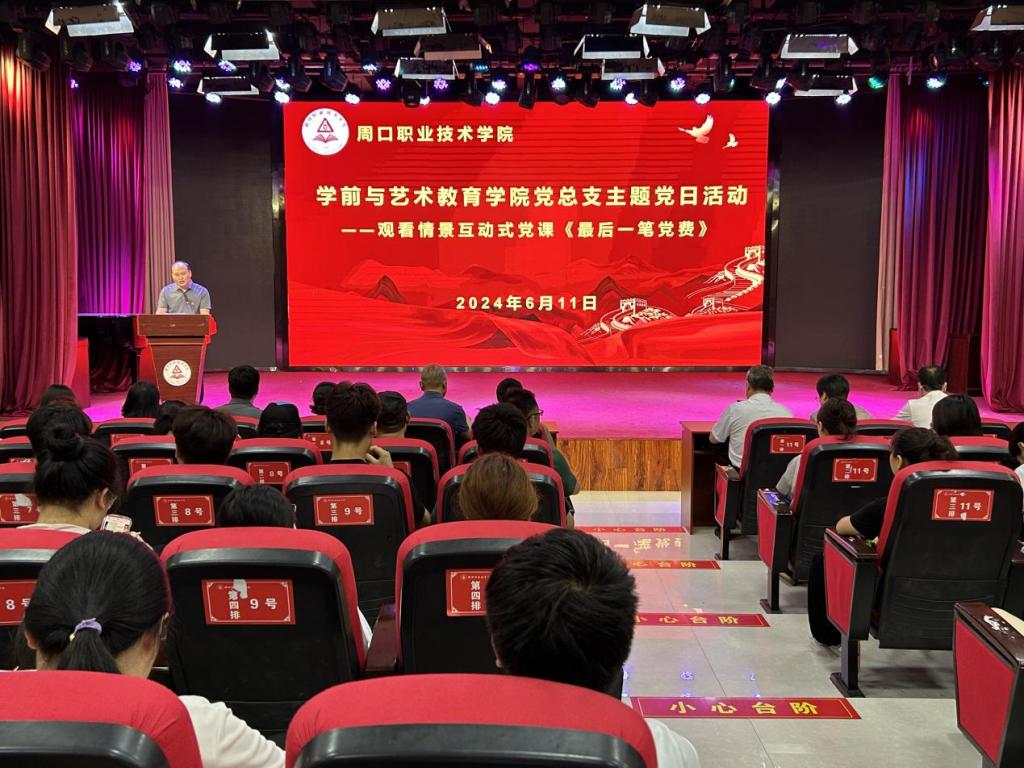 为充分发挥先进典型示范引领作用,教育引导全体师生坚定理想信念,6月11日上午,公司党总支在艺术演播厅开展主题党日活动,yl7703永利公司党委副书记李明臣、副董事长王隼、宣传部部长万四新、组织部部长张丹出席现场,公司领导班子、全体教师、党员发展对象、入党积极分子及戏曲专业全体员工参加活动。在座人员一同观看了情景互动式党课《最后一笔党费》。活动由经理高岐奎主持。