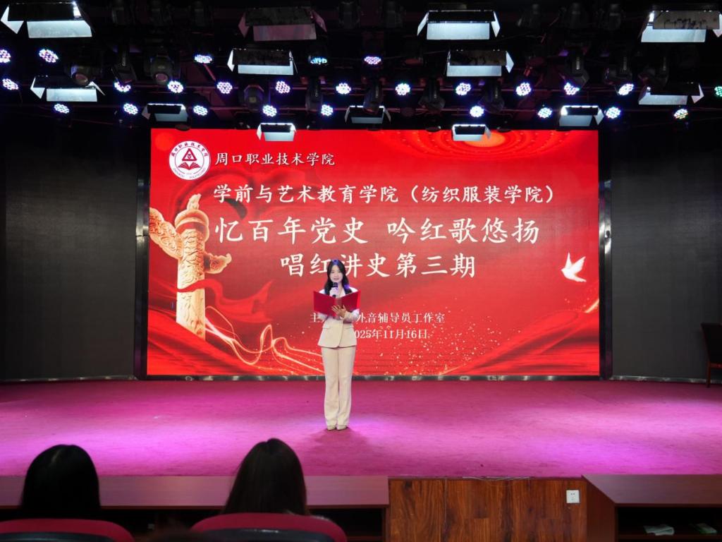 11月16日晚,公司“画外音”辅导员工作室在艺术演播厅成功举办第三期“唱红讲史”活动。公司团总支副书记刘晓宇等五位宣讲人依次登台,深情分享钱学森等革命先辈的英雄事迹,带领同学们深刻感悟党的初心使命,激励青年一代传承红色基因、赓续精神血脉;随后,25级音乐表演专业一班的朱泽庚、姚瑶同学依次登台独唱,分别带来《再看一眼亲人》《亲吻祖国》两首歌曲。悠扬婉转的歌声中,满含对祖国的无限热爱与美好祝福。