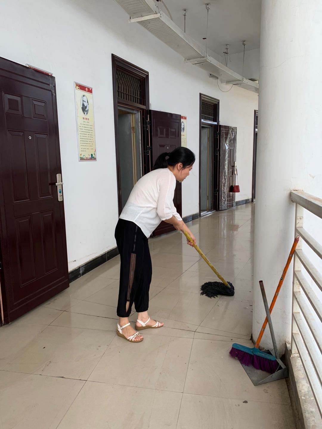 (图为彭莹老师在打扫走廊)