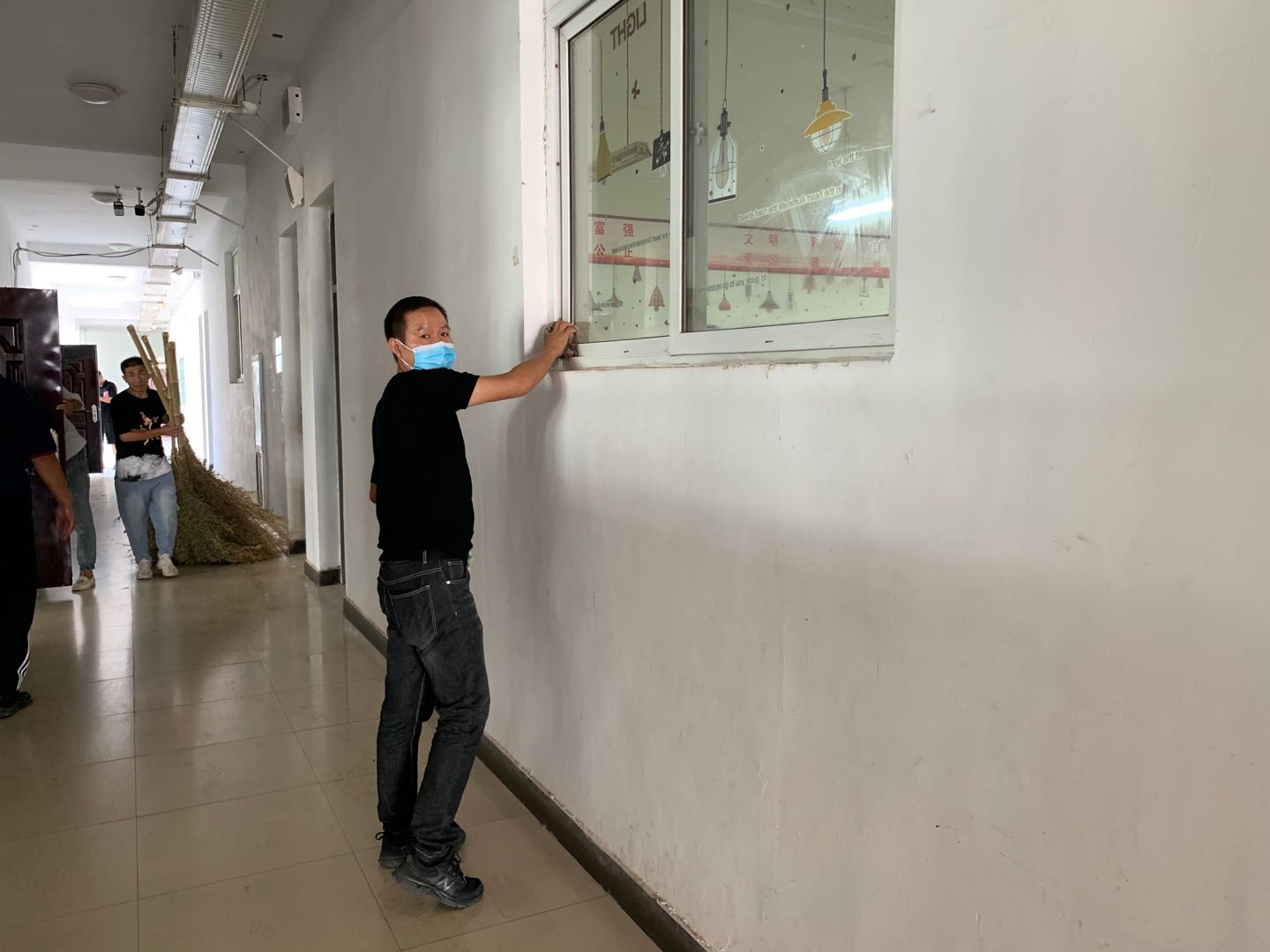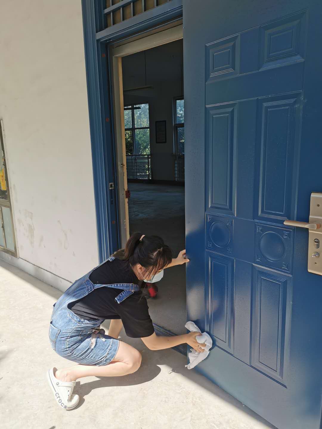 (图为巴云中老师在擦拭门窗)