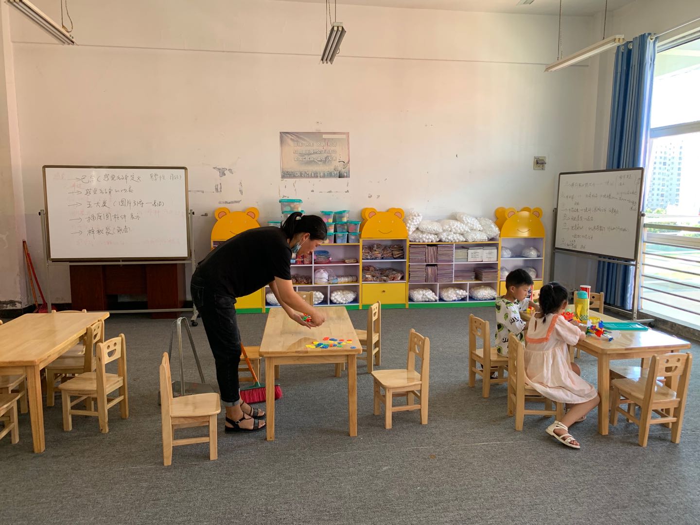 (图为方方老师带着还未开学的孩子在整理实训室物品)