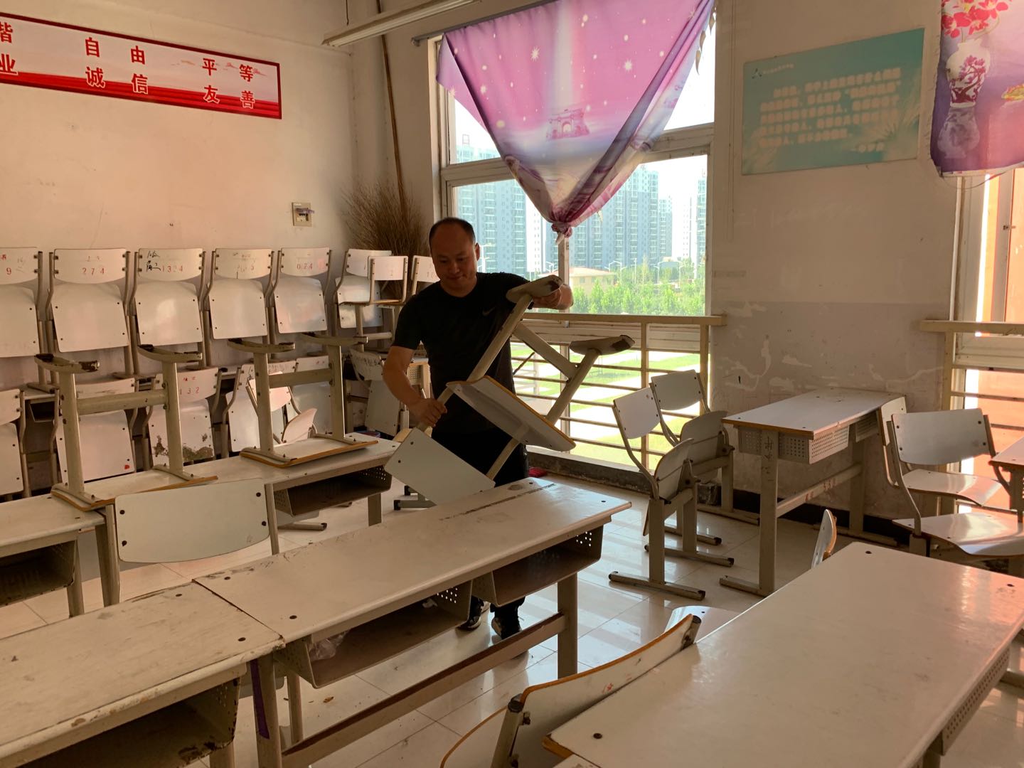 (图为朱亚峰老师在擦拭教室门窗)