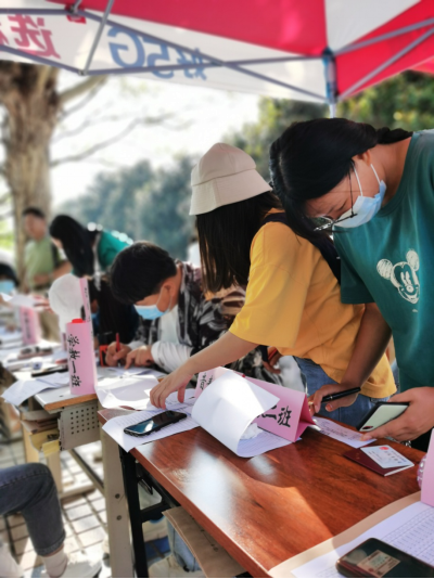 按照疫情防控工作程序,员工们在校门口有序排队,体温测量并进行消毒后来到接待现场,寻找自己所在班级,进行身份和健康证明核验。
