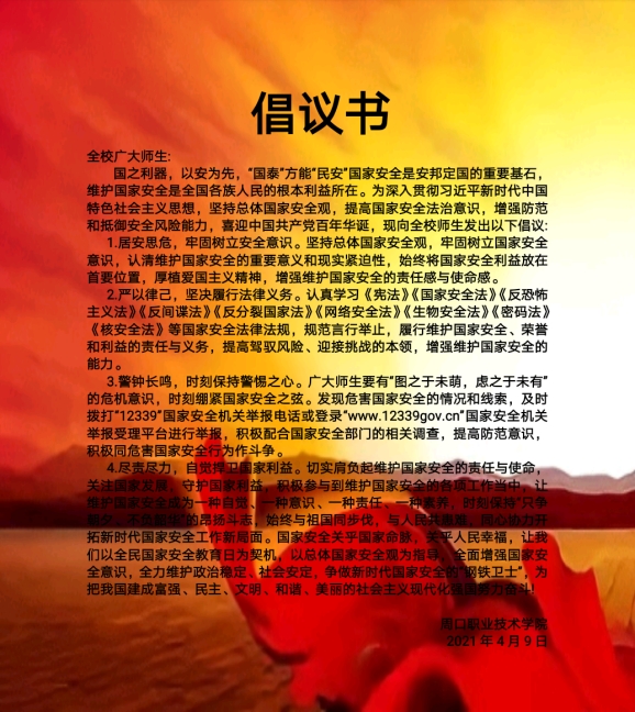 此次活动,将党史学习教育活动和“全民国家安全教育日”宣传教育活动结合起来,进一步激发大家爱党爱国热情,将党史学习的热情升华为维护国家安全的实际行动,增强全民爱国固边的凝聚力,切实形成维护国家安全的强大合力,为维护国家安全、平安和谐校园创造良好法治环境。