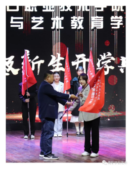 典礼最后举行了隆重的授旗仪式,党总支书记王爱东亲手把17个新生班班旗逐一授给班级代表,班旗传递着学艺的精神,班级的团魂和希望。面对象征着班级荣誉的班旗,同学们抑制不住内心激动的心情,旗手们用力挥舞着红旗,现场一片沸腾。