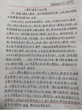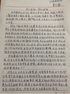 此次团日活动中,各班级团支书紧紧围绕团日主题,向同学们介绍了国家公祭日的由来,通过集体观看爱国主义教育影片《东京审判》,再现日本帝国主义侵华战争中所犯下的滔天罪行来教导同学们勿忘国耻,牢记使命。同时,开展爱国主义主题征文活动加深同学们对南京大屠杀历史的认识和理解。
