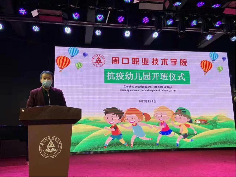 高岐奎做总结发言。他指出,开办“抗疫幼儿园”,不仅让老师们能够更好地投入到工作一线去,而且让小朋友们在疫情下的校园生活同样多姿多彩,同时又给学前教育专业的同学们创造了实践机会。他希望在校领导的支持和帮助下,在全校教职工的关爱下,“抗疫幼儿园”能够真正成为孩子们的乐园。