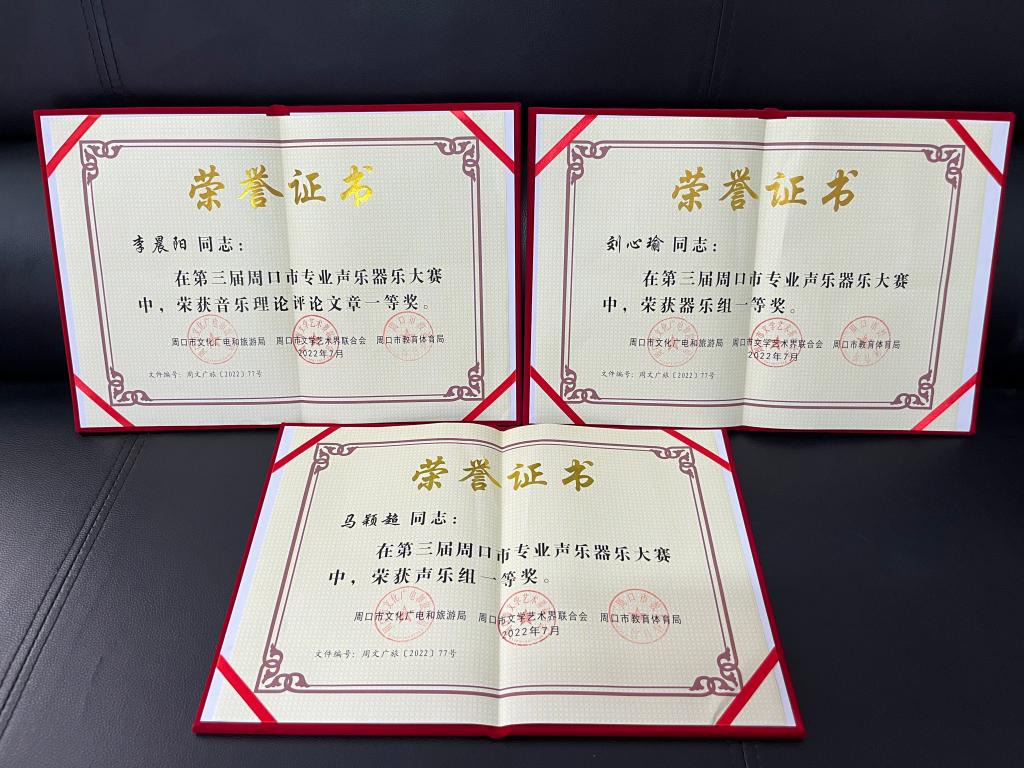 近日,由周口市文化广电和旅游局、周口市文学艺术界联合会、周口市教育体育局联合举办的第三届周口市专业声乐器乐大赛在市文化馆举办。公司派出音乐教研室马颖超、刘心瑜、李晨阳三名教师,分别参加声乐、器乐和音乐理论评论三项比赛,取得三个一等奖的优异成绩。