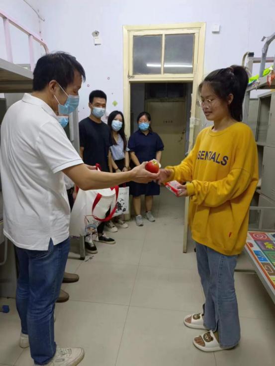 公司领导班子及新生辅导员来到校外酒店看望返校新生并进行了亲切慰问,让同学感受到了来自公司的温暖,员工父母对此表示感谢。随后,来到宿舍对提前到校新生进行慰问并送上公司精心定制的中秋大礼包,里面有象征着团圆的中秋月饼和希望同学们平安到校的爱心苹果,希望能让新同学感受到公司浓浓的爱与关怀。
