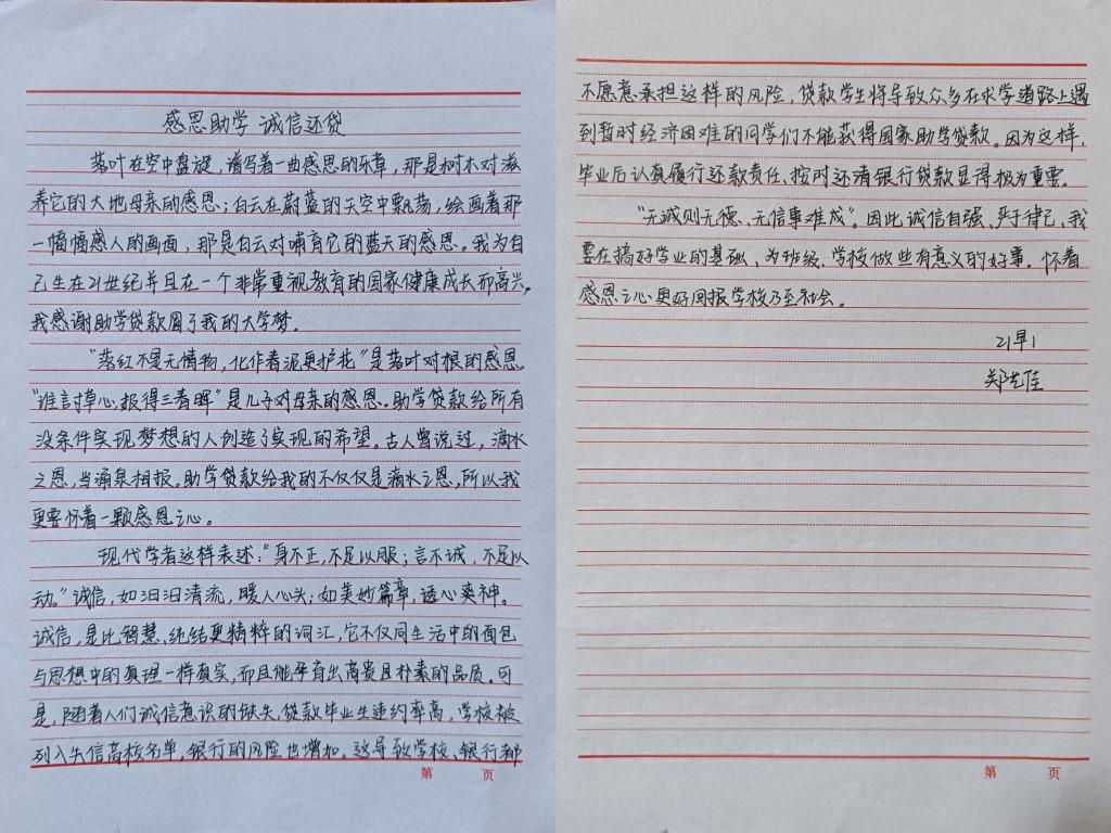 为大力宣传国家员工资助政策,强化对员工的诚信感恩教育力度,让同学们常怀感恩之心、健康快乐成长,yl7703永利面向全体在校员工开展了“感恩助学,诚信还贷”主题征文活动。