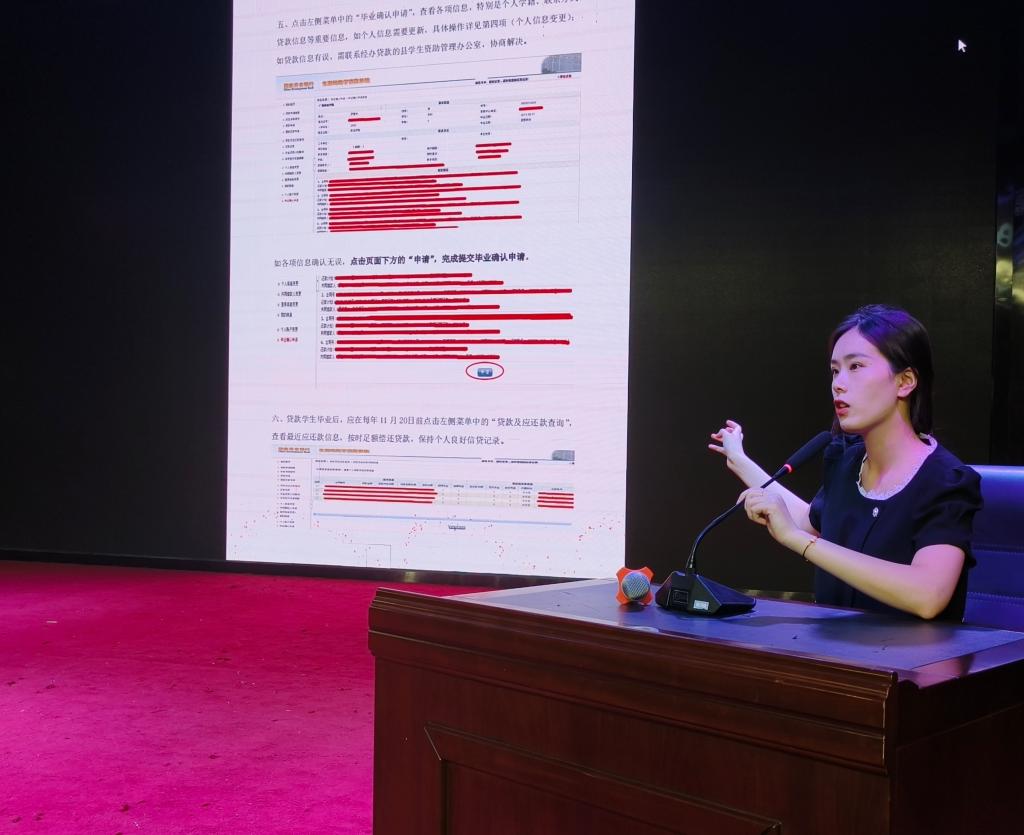 宣讲会上,资助专员石孟晓围绕高校员工助学贷款政策体系,对生源地助学贷款、校园地助学贷款等资助政策进行介绍说明,对其申请条件、发放指南、毕业确认、还款流程四个方面作了详细讲解。随后,石孟晓老师认真为同学们答疑解惑,结合老员工未及时清偿助学贷款的具体案例,强调维护个人信用的重要性,引导员工提高征信意识,主动履行贷款承诺,按时还付贷款本息。