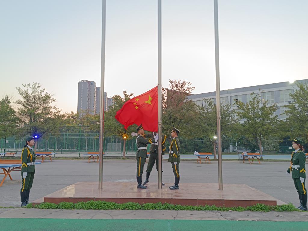 迎着晨光,国旗护卫队昂首阔步,护卫着鲜艳的五星红旗步入旗台。伴随着雄壮的国歌声响起,全体师生唱国歌行注目礼,共同见证五星红旗冉冉升起的庄严时刻。