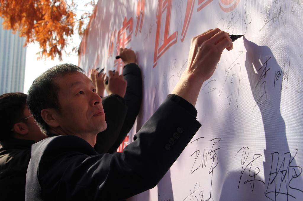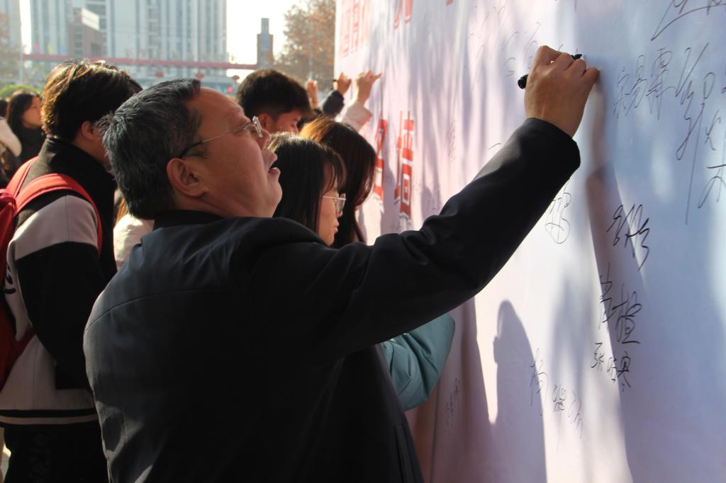 宪法签名活动中,全体师生郑重地在印有“强国有我,‘宪’在周职”的签名墙上签下了自己的名字,表达自己尊崇宪法,捍卫宪法权威的承诺和决心。