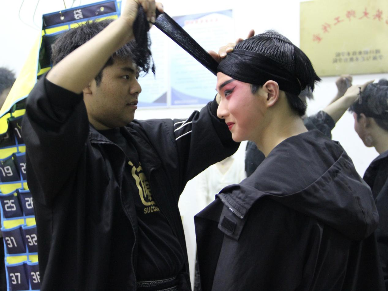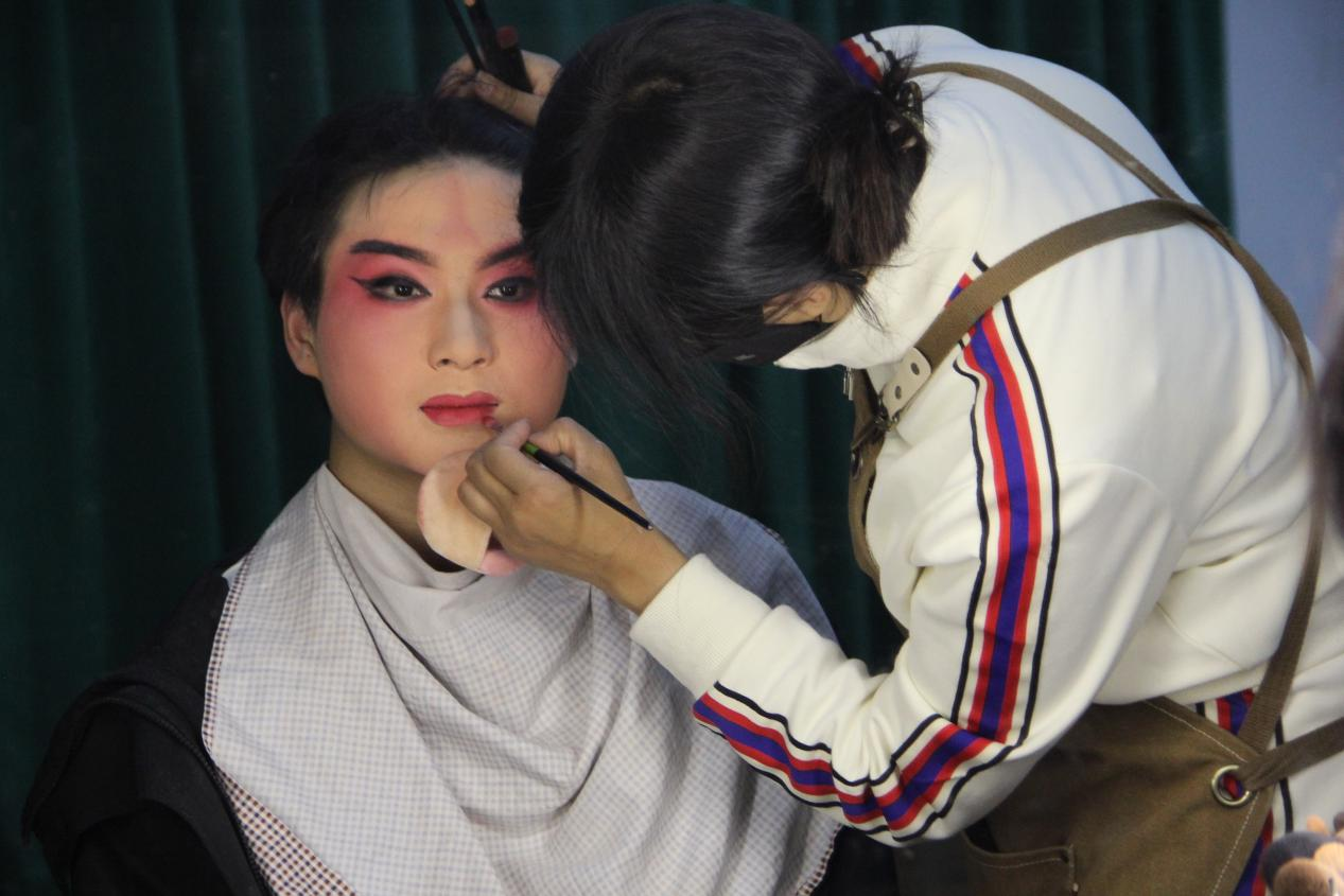 排练现场参赛员工陆续开始化妆、勒头、换装分别有序进行训练保证以高标准的艺术质量圆满完成参赛任务