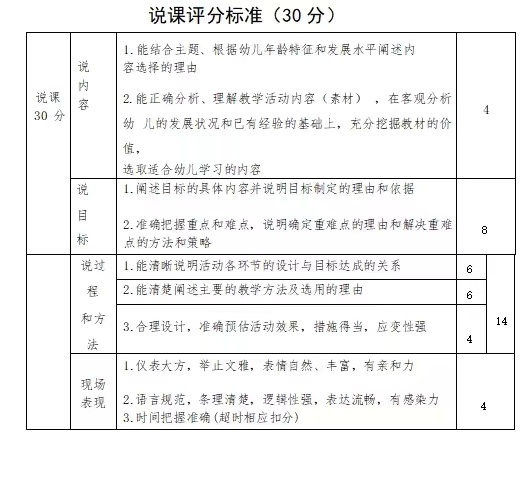 3.说课:根据模拟教学,就目标、内容、方法、过程设计等进行说课,说清楚“学什么、教什么”“怎么学、怎么教”,以及“为什么”等问题,条理清楚,逻辑性强,语言规范,表达流畅在5分钟内完成。