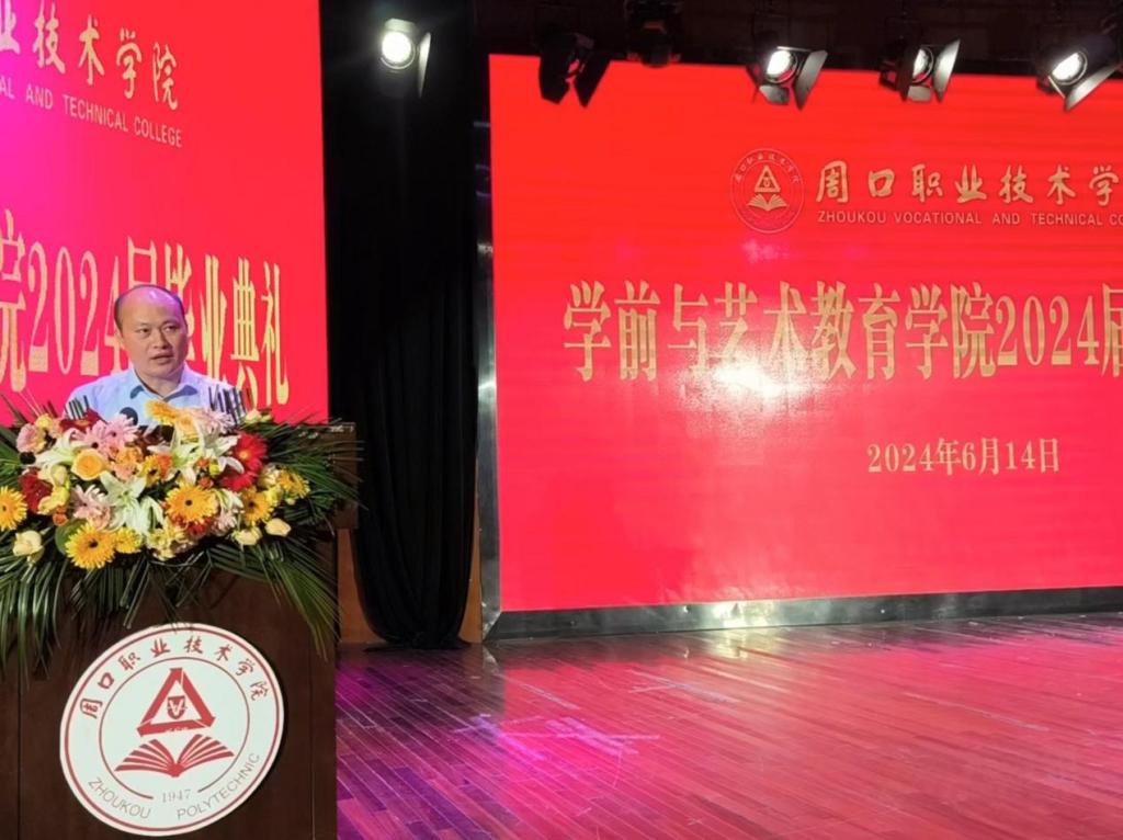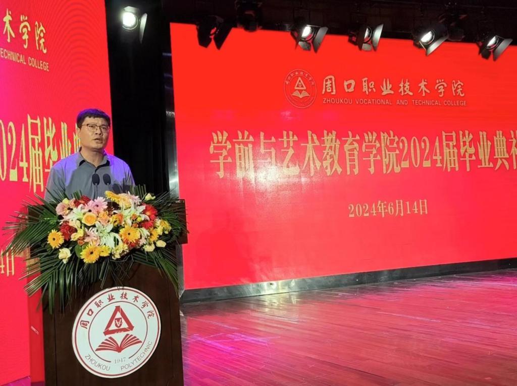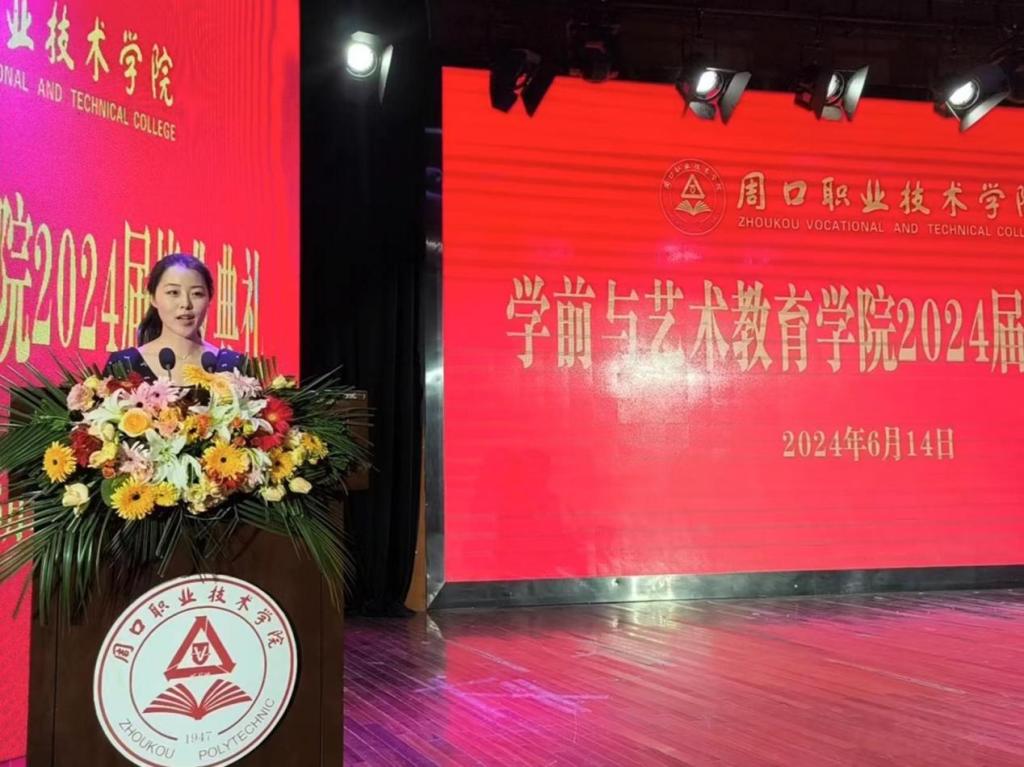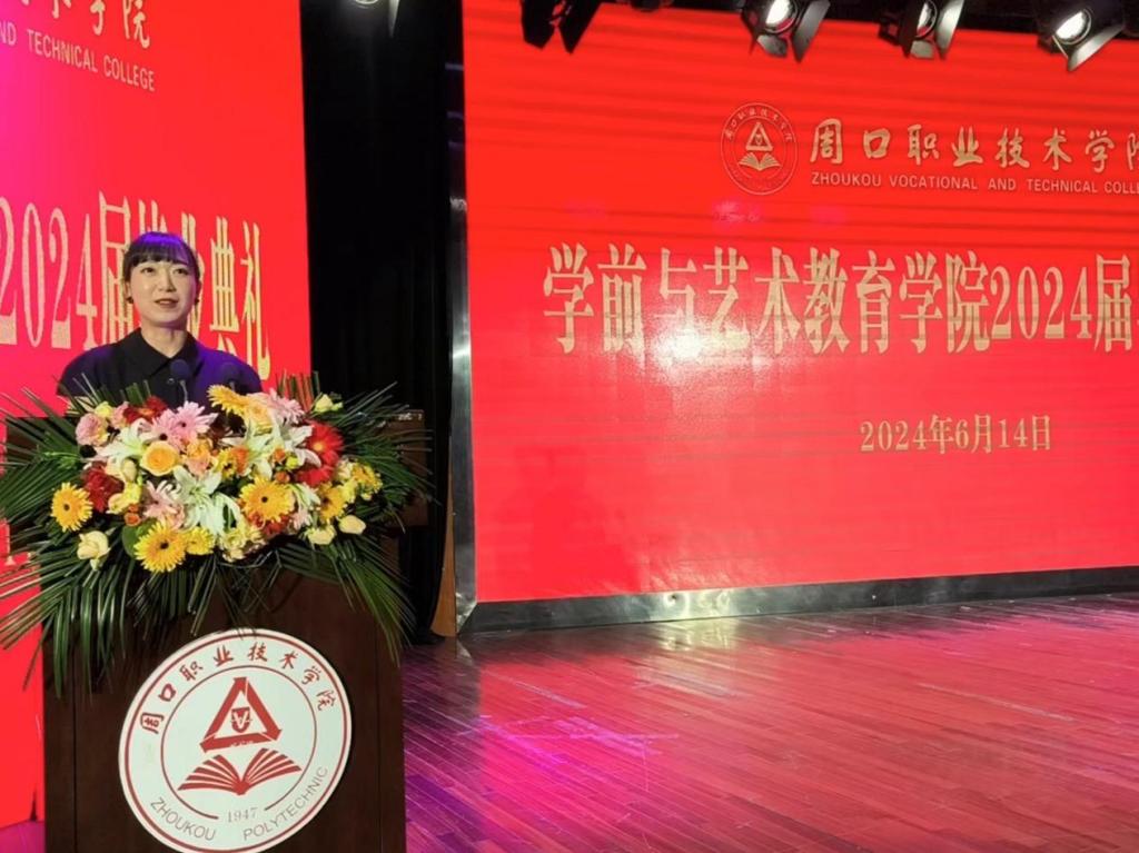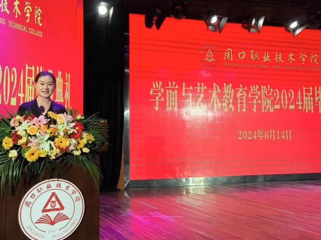 在校生代表2022级早期教育专业二班朱琳琳同学对那些即将踏上新旅程、揭开人生新章节的学长学姐们,致以最真挚的祝福。祝愿学长学姐们一帆风顺、前程似锦。同时,她表示将把他们作为楷模,勤奋学习,争取为公司的荣誉添砖加瓦。
