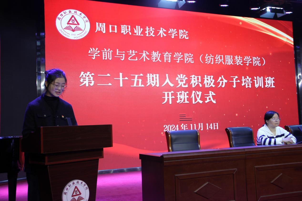 23级学前教育五班彭张敏作为入党积极分子代表发言,她对党组织的培养和关怀表示衷心感谢,誓以党员标准严格要求自己,以实际行动践行党的理想信念,争取早日成为一名光荣的共产党员!