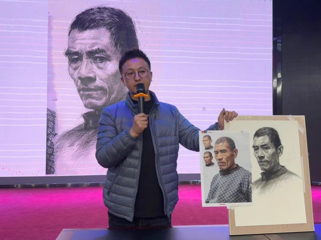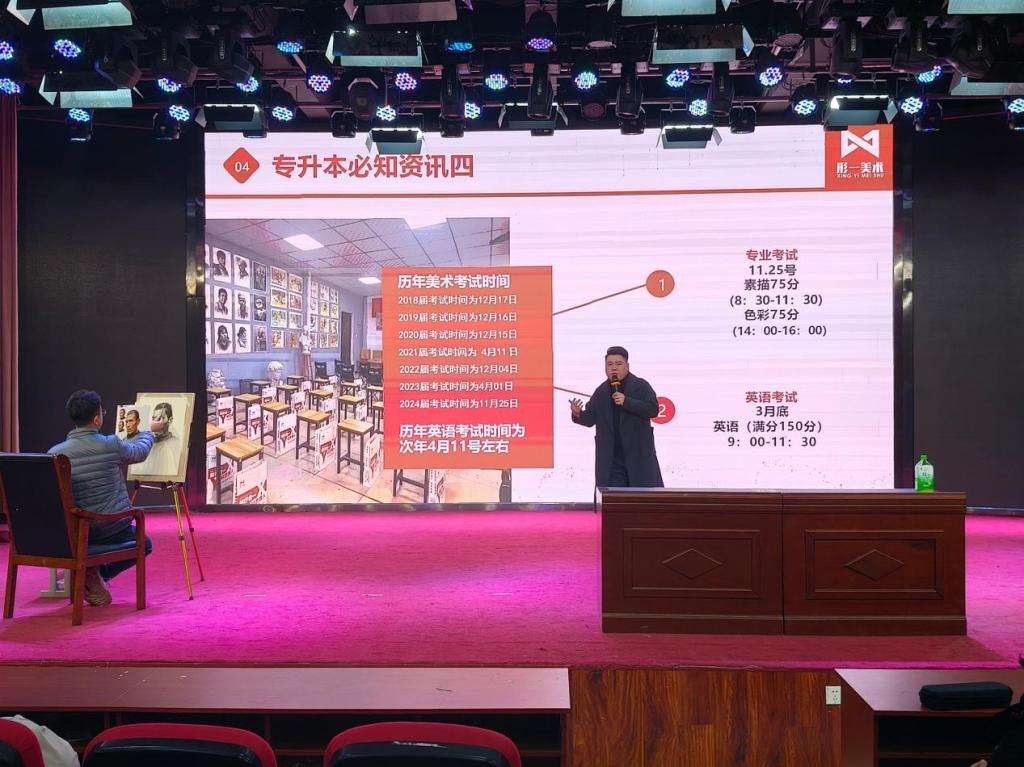 形一美术执行董事长纪鹏飞作为主讲人,他以“提高学历层次,成就美好未来”为主题,全面而深入地剖析了河南省专升本政策的整体框架,讲解了报考条件、考试科目、招生计划等关键要素。随后,机构老师通过现场作画的方式,生动展示了应对专升本考试所需的综合能力,为同学们提供了直观的学习范例和启发。
