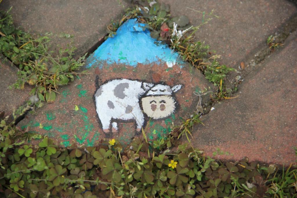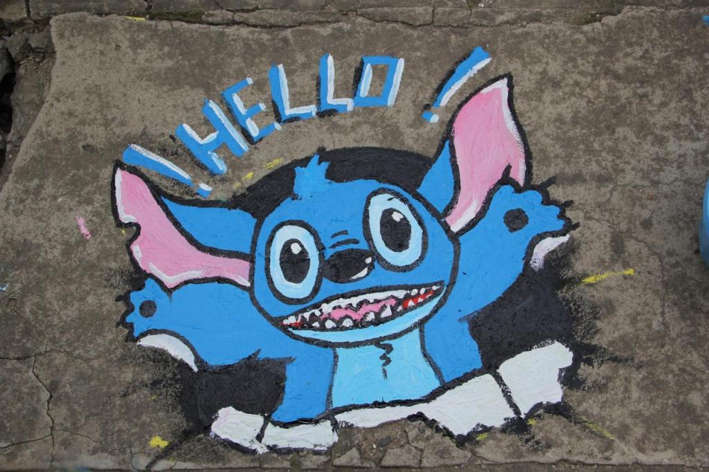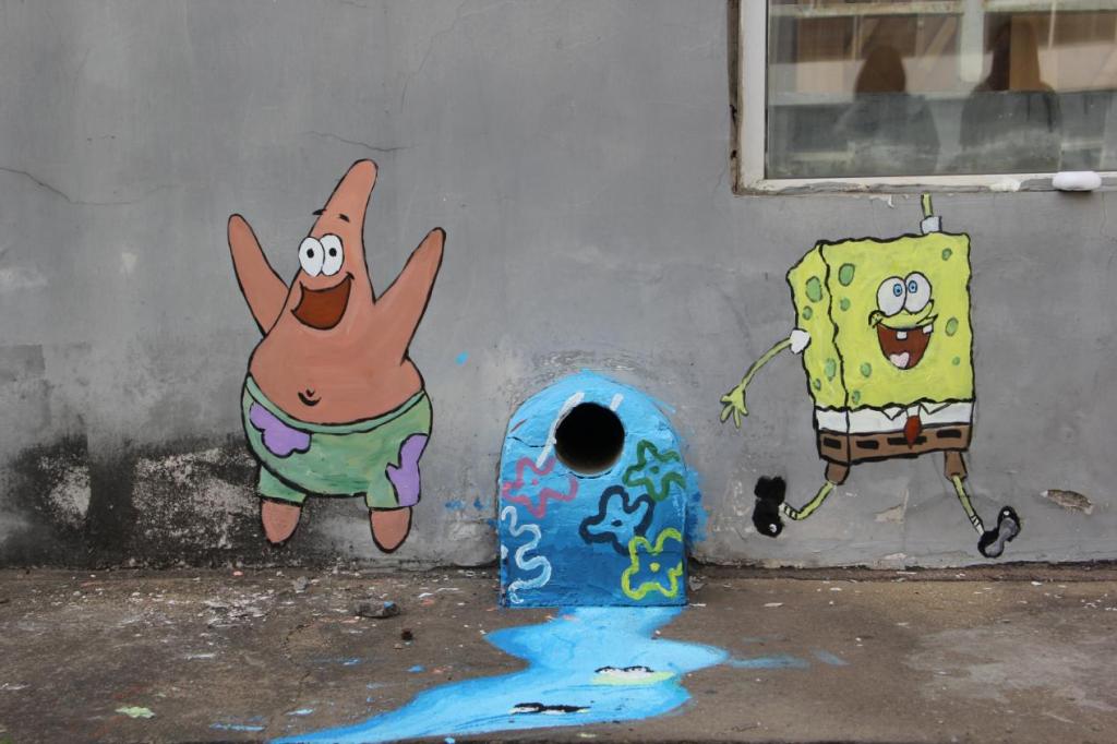瞧!原本单调无色的地面,如今变成了一本巨型的童话绘本,员工们不畏炎炎烈日,用膝盖当画板、汗珠作调色剂,把海绵宝宝、史迪奇等各种各样的卡通图案统统“种”进了滚烫的地面。