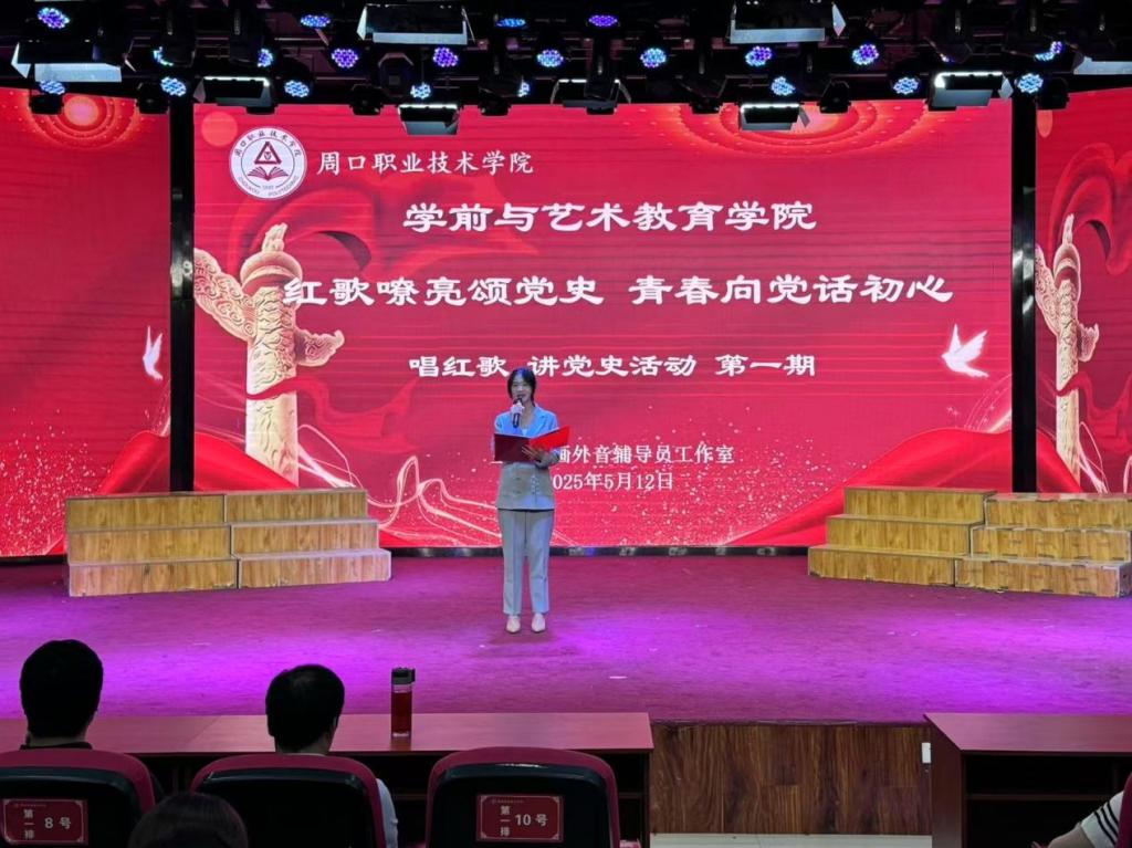 5月12日晚,由公司“画外音”辅导员工作室承办的第一期唱红歌、讲党史活动在艺术演播厅举行,公司党总支书记王春生、副经理杨晨、学管办主任郑玉凡、23、24级辅导员代表及各班班长、入党积极分子参加活动。