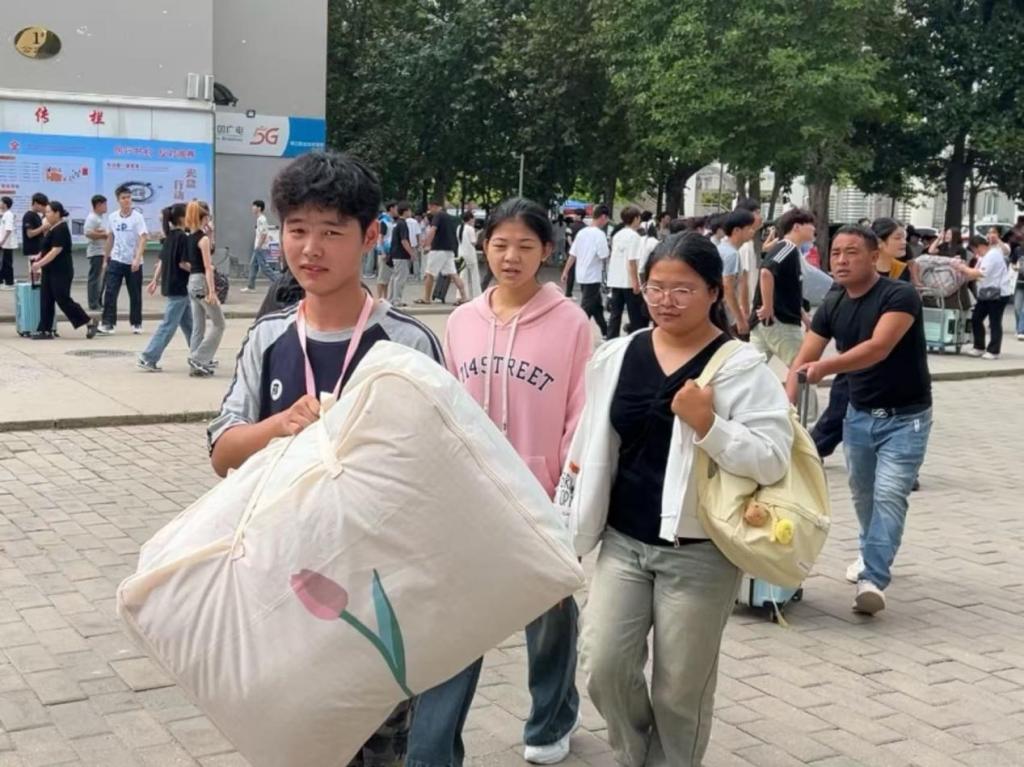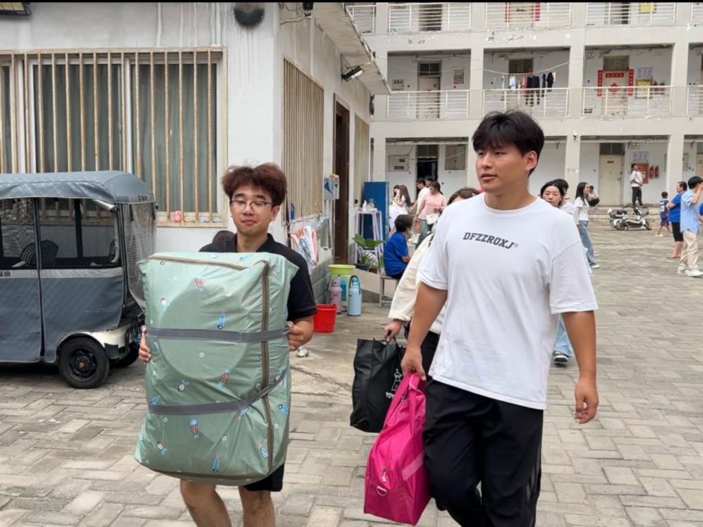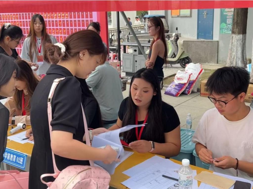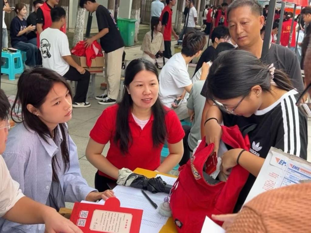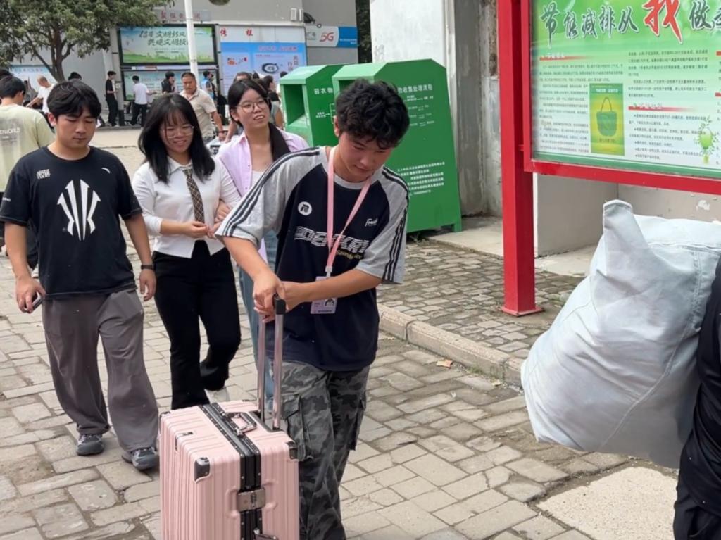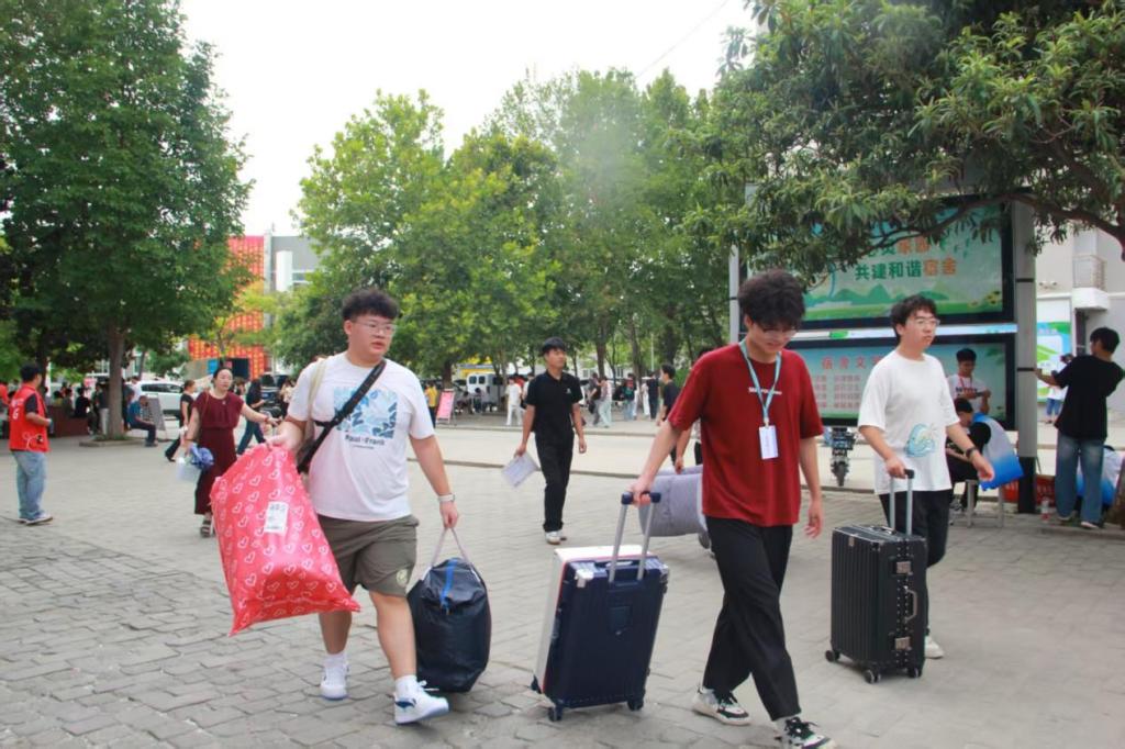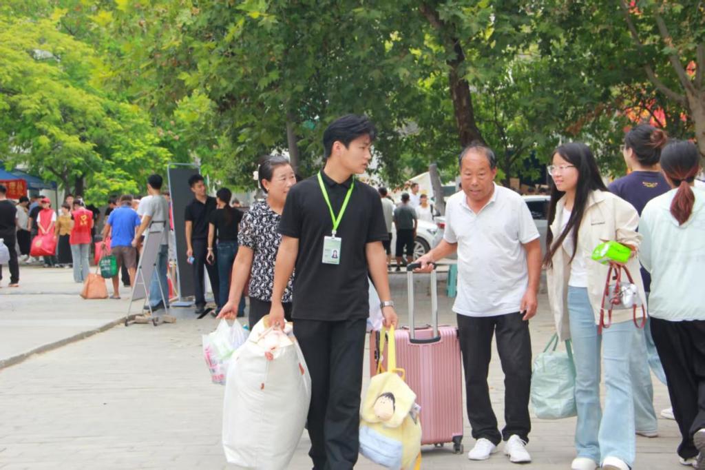 报道现场,工作人员们在报到点逐一核对新生的信息,悉心办理入学手续并提供相关指引;随后,带领新生前往宿舍,沿途介绍校园设施,并及时解答新生提出的疑问,让新生快速熟悉校园。