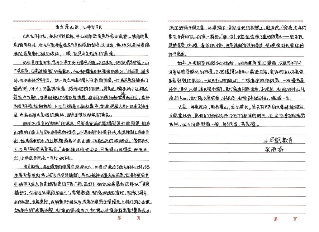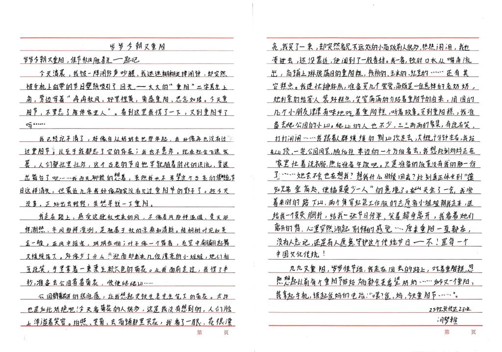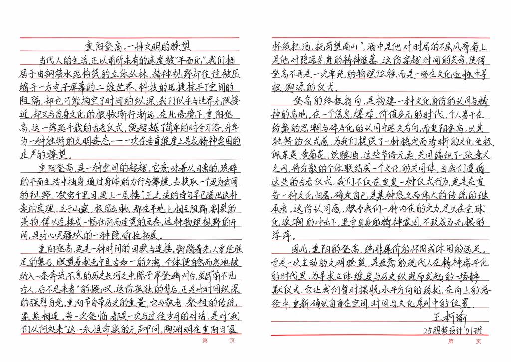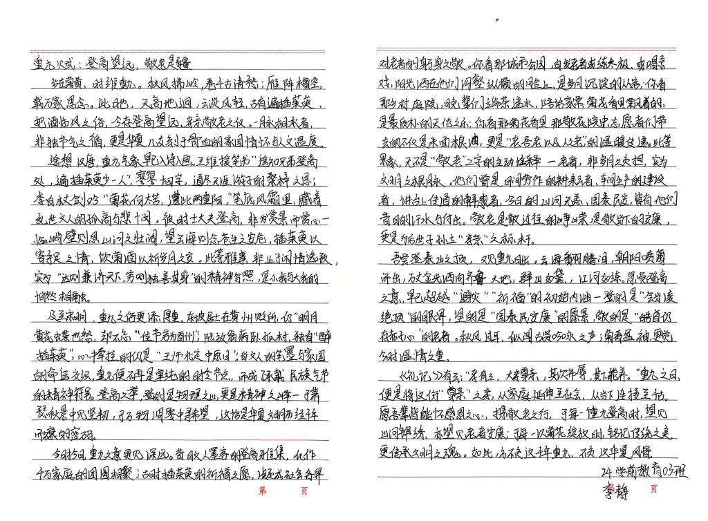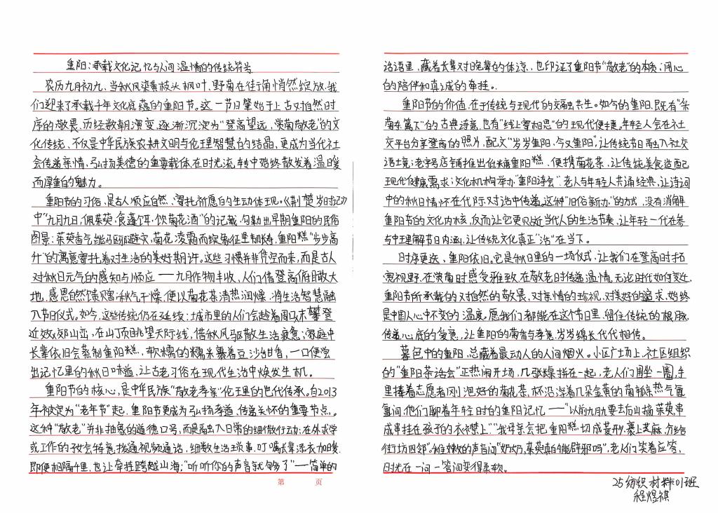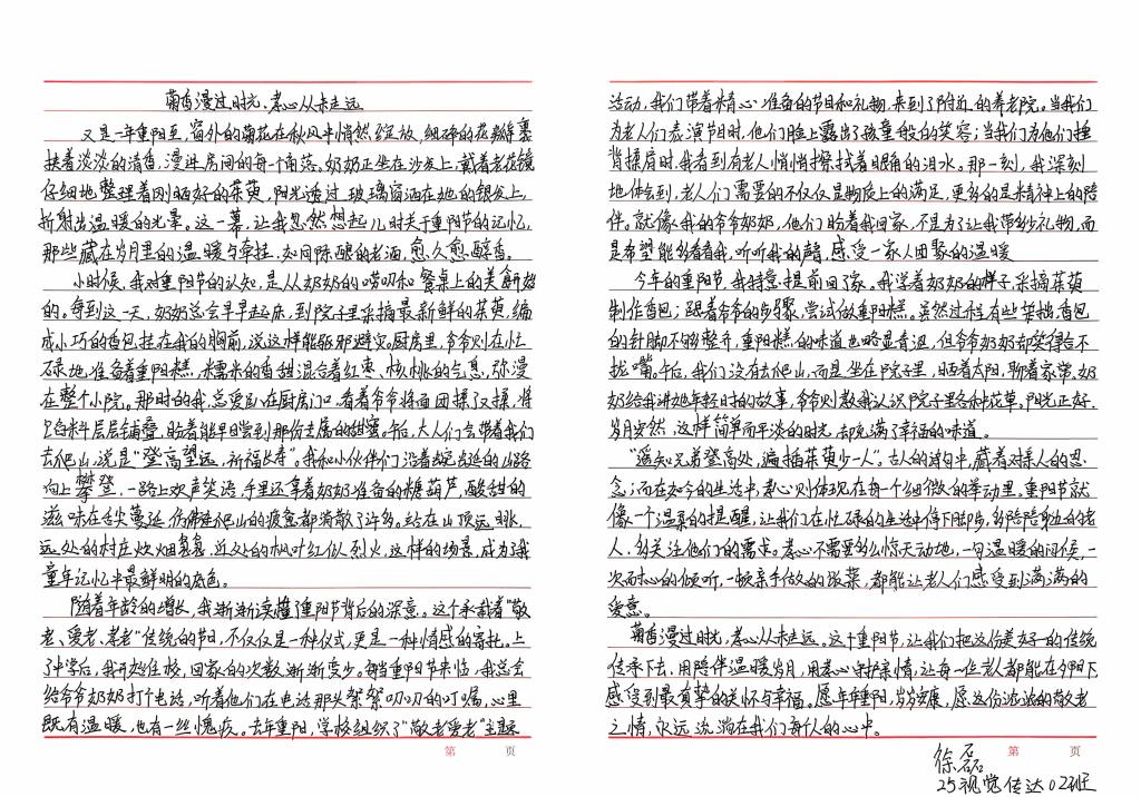 同学们认真查阅资料,不仅深入了解插茱萸、吃重阳糕的传统习俗,还探究了“久久长寿”的深层文化寓意;随后以文字为载体,将所学所得、所思所感化作个人体悟,创作出一篇篇情真意切的佳作。接下来,让我们共同欣赏这些佳作吧!