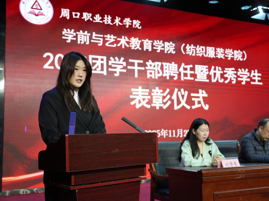 员工干部代表25级服装设计与工艺01班崔竞文在发言中深切表达了对公司的感激之情。她承诺,未来将以更饱满的热情和务实的态度履行职责,积极发挥桥梁纽带作用,全心服务同学、凝聚集体力量,将个人成长与公司发展紧密相连。