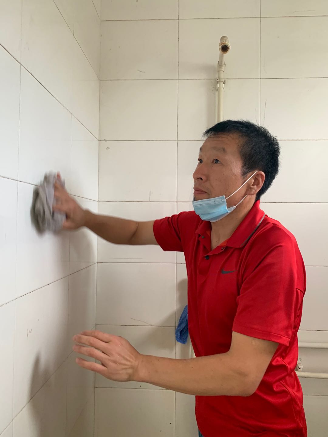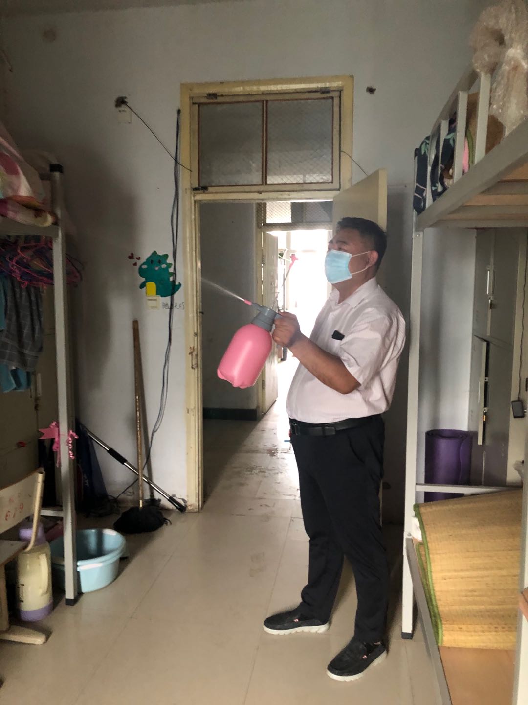 公司教师走进宿舍后,把每个宿舍开窗通风,齐心协力把布满灰尘的地面,桌子,用拖布、抹布打扫的一尘不染,不遗漏每一个宿舍,同时也对宿舍进行消毒杀菌,让“沉睡”的宿舍焕然一新。