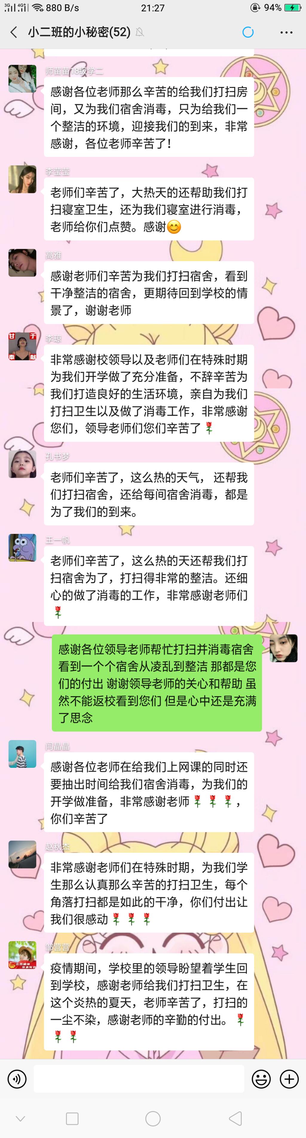 得知领导老师亲自走进宿舍打扫卫生,同学们纷纷表达自己的感想和感谢,这些在生活中看似平常的小事,却给即将返校的同学们带来了温暖。