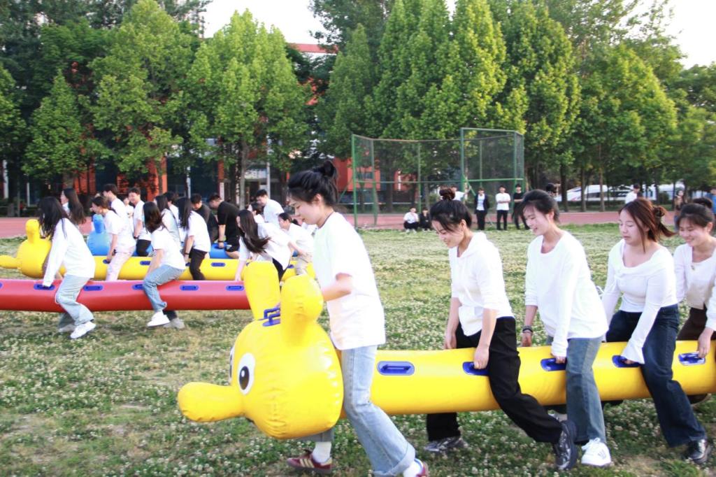 同学们骑在充气毛毛虫上,双手紧握固定把手,齐心协力向前冲。这项比赛不仅考验个人的平衡能力,更考验团队的协作与默契。同学们在比赛中互相鼓励、互相帮助,共同完成这项挑战,收获了合作的喜悦与成就感。