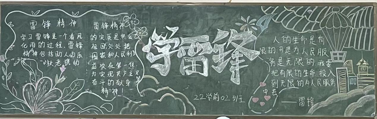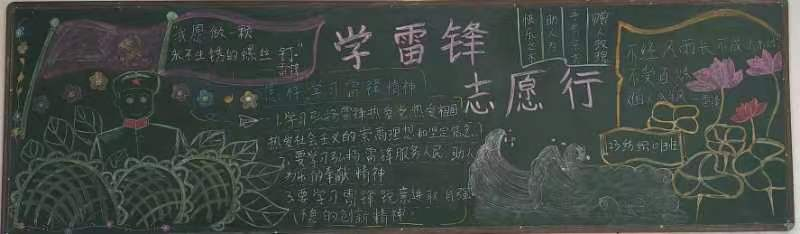 各班级积极参与,认真查找资料、精心设计,以主题突出、图文并茂的黑板报展示了同学们对雷锋的敬仰之情。黑板报追述了雷锋同志的光辉事迹,赞扬了他的“钉子”精神,歌颂了他全心全意为人民服务的品质。