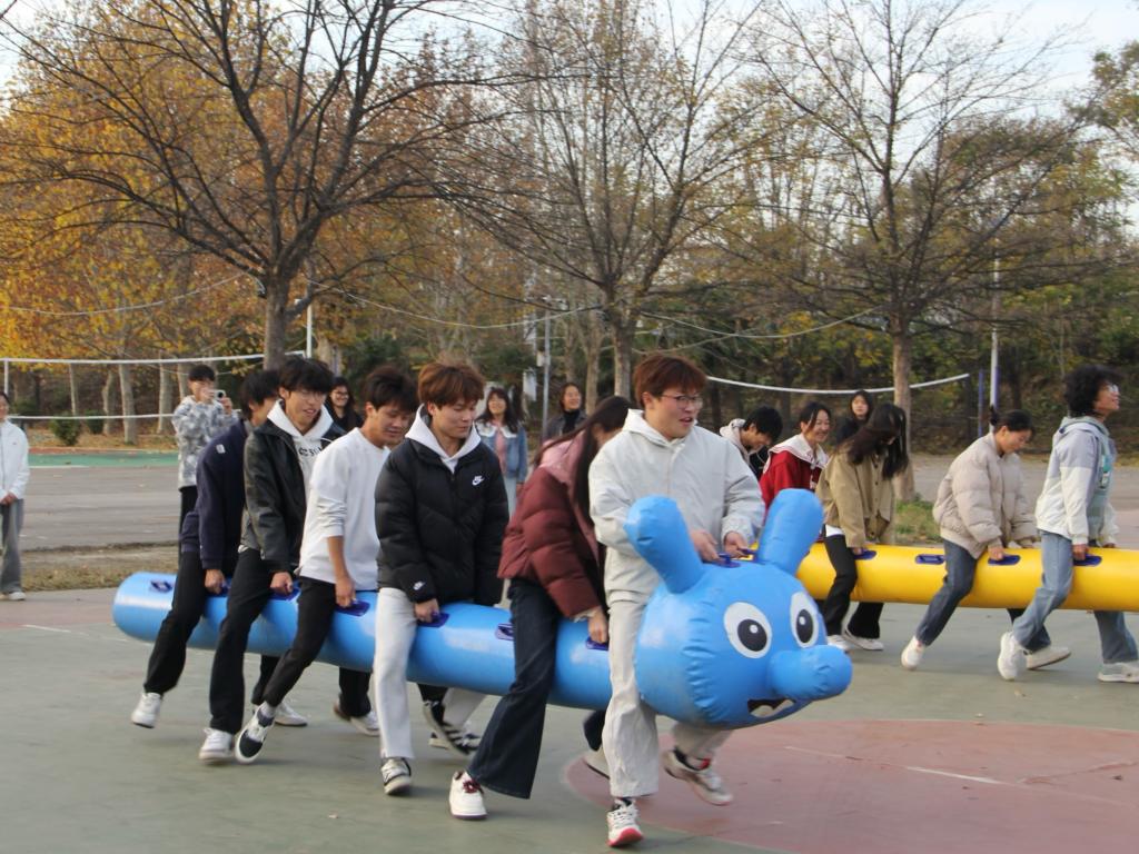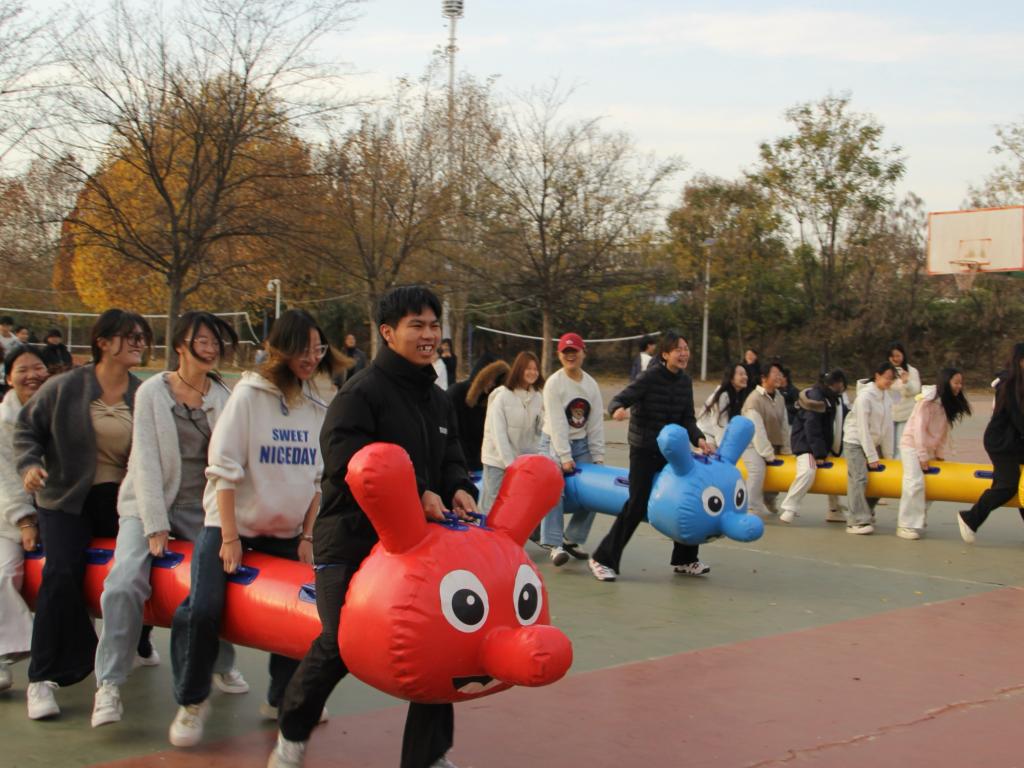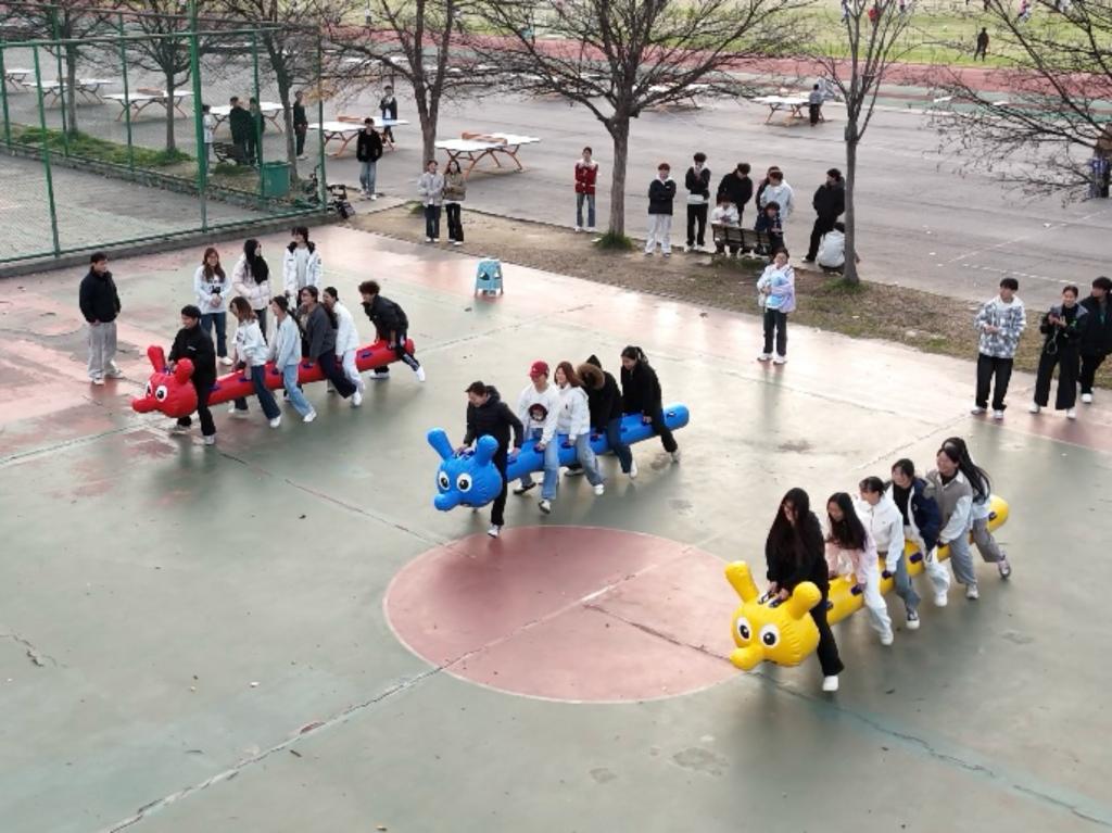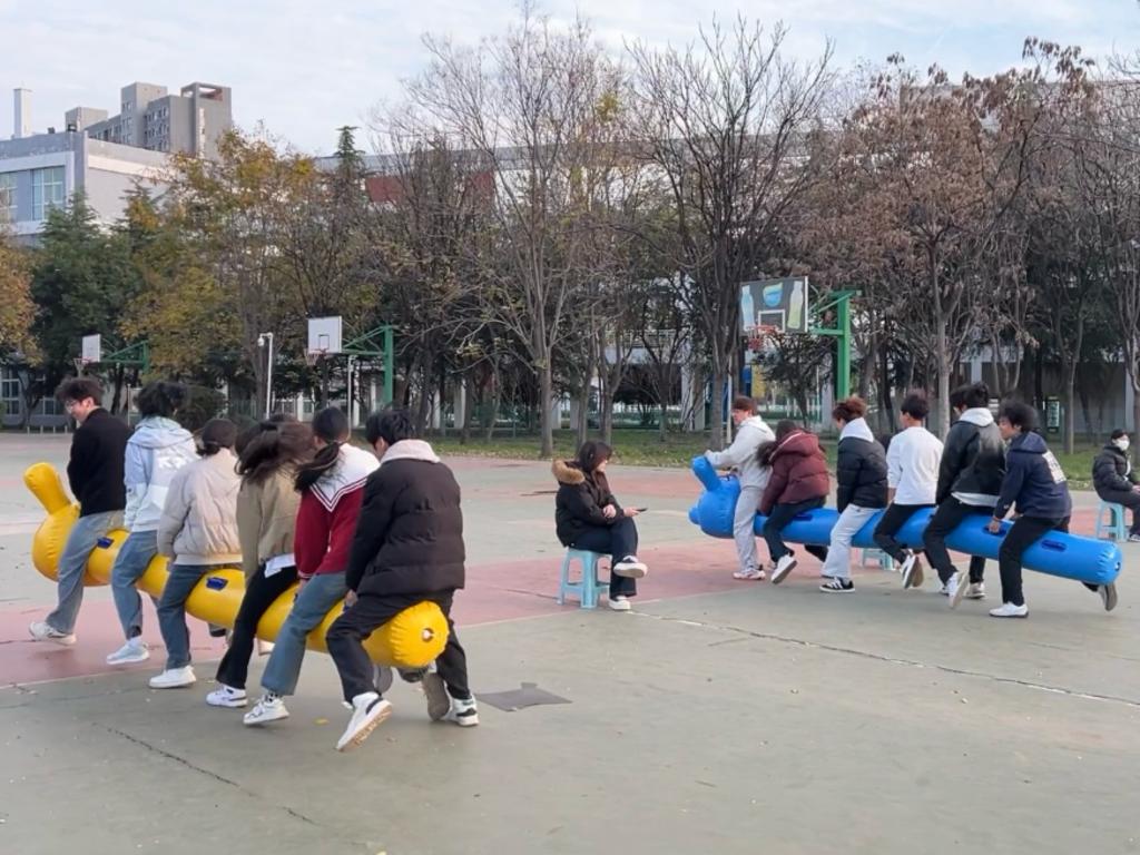 随着裁判哨声响起,参赛队员紧握“毛毛虫”道具,喊着整齐嘹亮的口号、迈着协调一致的步伐全力冲向终点。赛道两侧,加油呐喊声此起彼伏,比赛氛围持续升温。各队伍奋勇争先、为集体荣誉拼搏,充分展现了同学们坚韧不拔的意志与团结协作的团队精神。
