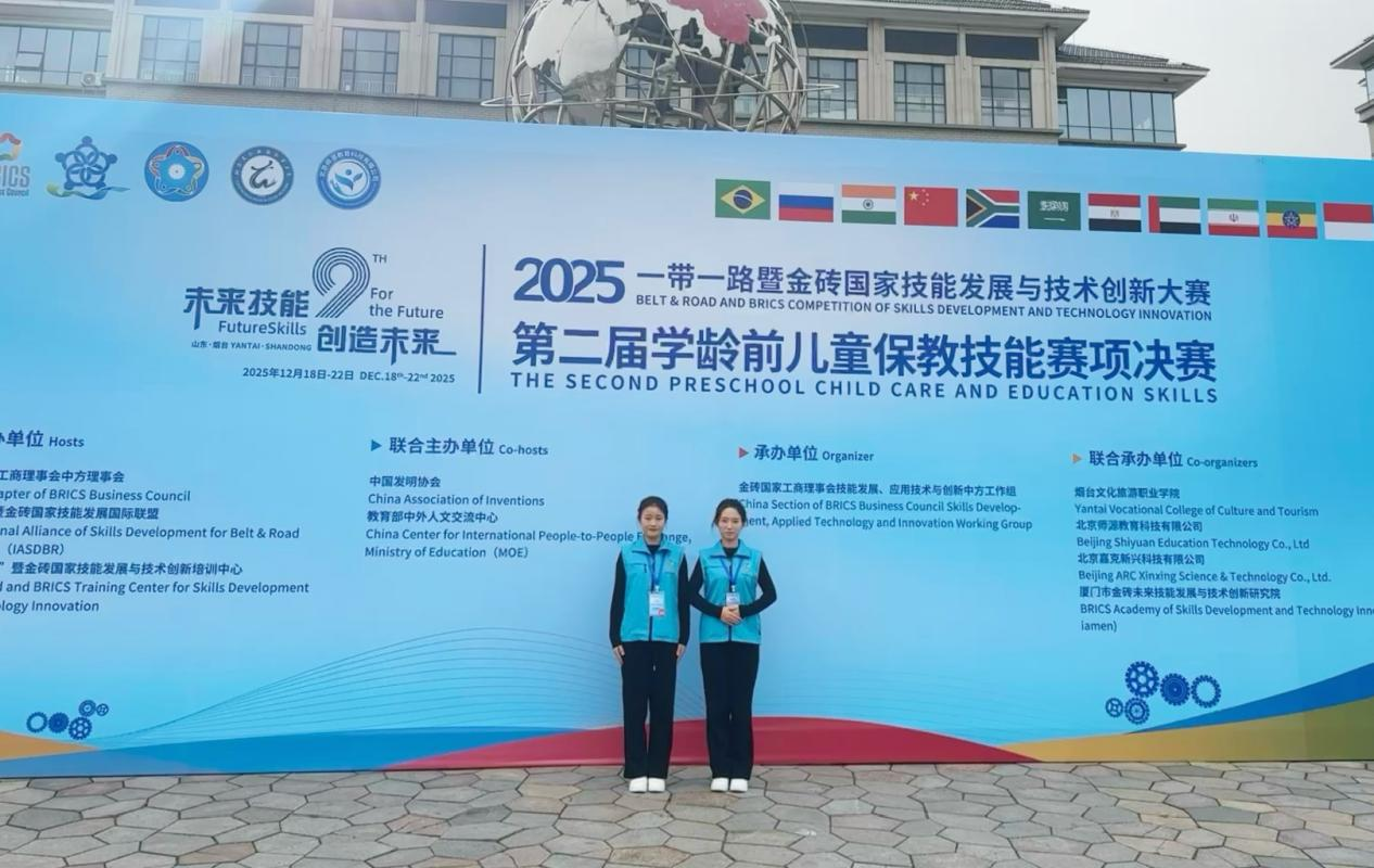 2025年12月20日,2025 一带一路暨金砖国家技能发展与技术创新大赛第二届学龄前儿童保教技能赛项在山东省烟台市烟台文化旅游职业公司成功举办。yl7703永利学前教育教研室精心组织、积极备赛,选派高校组参赛一队(李柯欣、武睿钦)参加本次技能竞赛。