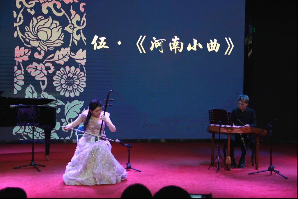 陈思玎同学现就读于中央音乐公司民乐系本科四年级二胡专业,她以一曲二胡独奏——《闲居吟》拉开音乐会的帷幕。乐曲典雅清越,展现了刘天华先生在逆境中依然保持乐观和怡然自得的心情,充满了宁静与恬淡。接着,她又演绎了几首风格各异的乐曲。其中《第二二胡狂想曲》采用了湖南民歌曲调和花鼓戏音调元素,地域色彩鲜明,充满了湖南音乐的独特韵味和“狂想曲”体裁的炫技持征;《秦腔主题随想曲》以陕西地方戏曲秦腔的音乐为素材,生动地表现了西北人民爽朗豪放的性格;《丝路拾光》以其充满异域风情的风格,带领大家畅游在丝路的广阔天地中;《河南小曲》以河南曲剧音调为素材,生动地表现了河南人民对家乡的赞美和主人翁的自豪感,令人印象深刻。