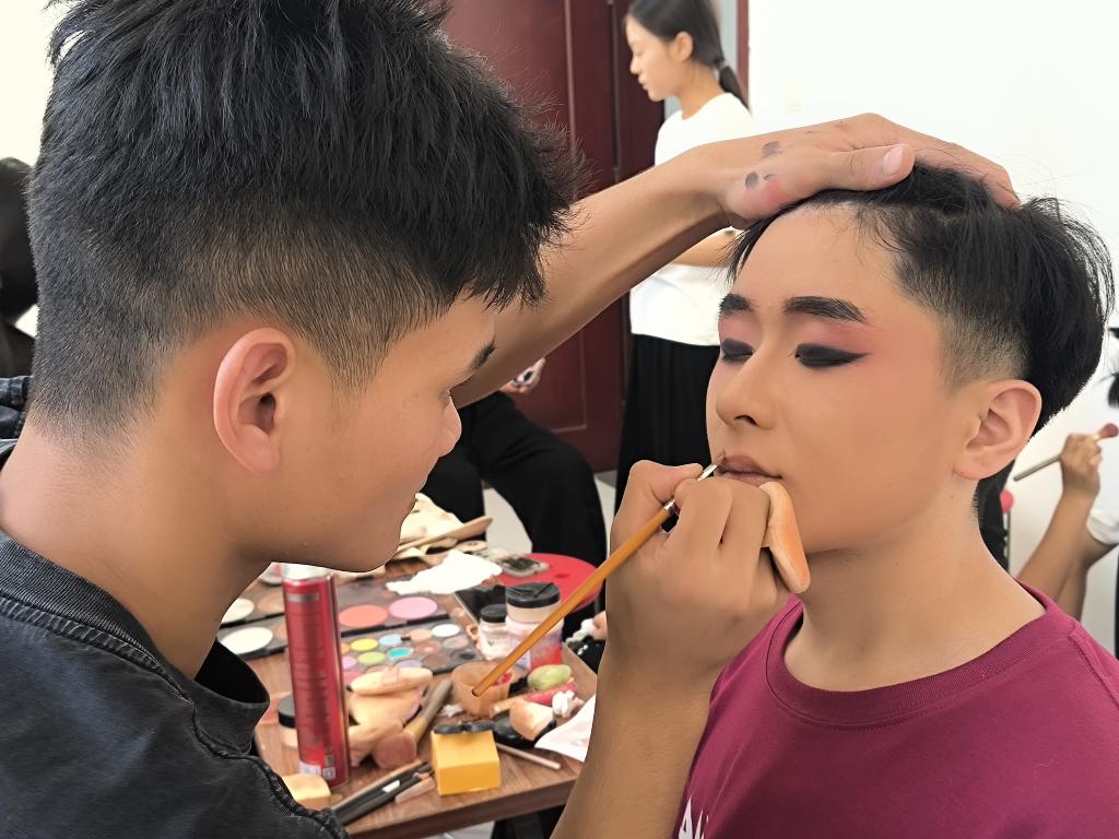 演出前夕,后台化妆间忙碌而有序。从妆容到衣着,每个细节都展现出师生对舞台的敬畏和艺术的追求,他们怀揣着对革命先烈的崇敬和对祖国的热爱,精心准备,确保将演出精彩地呈现给每一位观众。