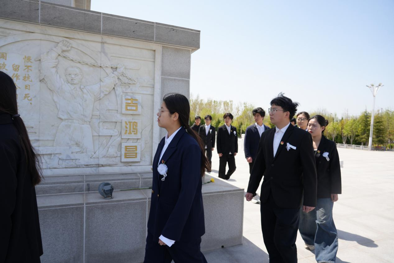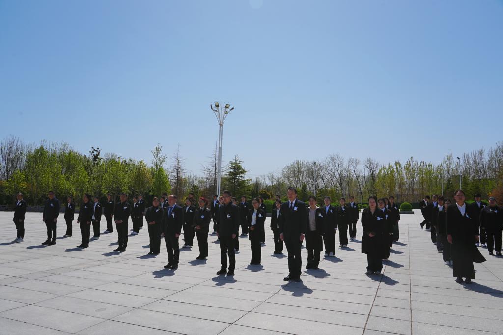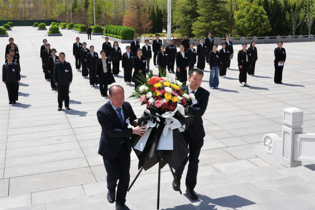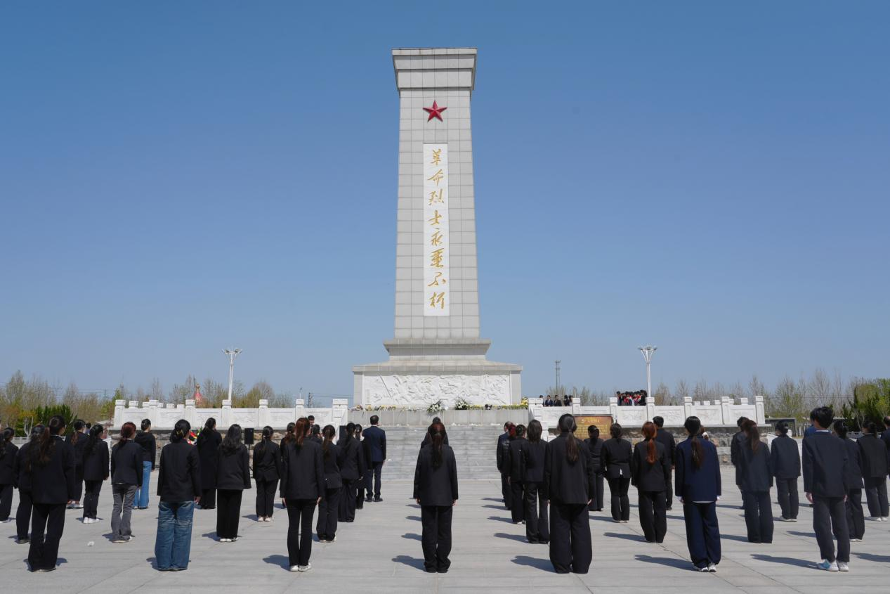 全体师生整齐列队,齐唱国歌,面向革命烈士纪念碑肃立默哀,表达对先烈的深切缅怀。王春生和高岐奎向纪念碑敬献花篮,寄托对革命先烈的深切缅怀与无尽哀思。