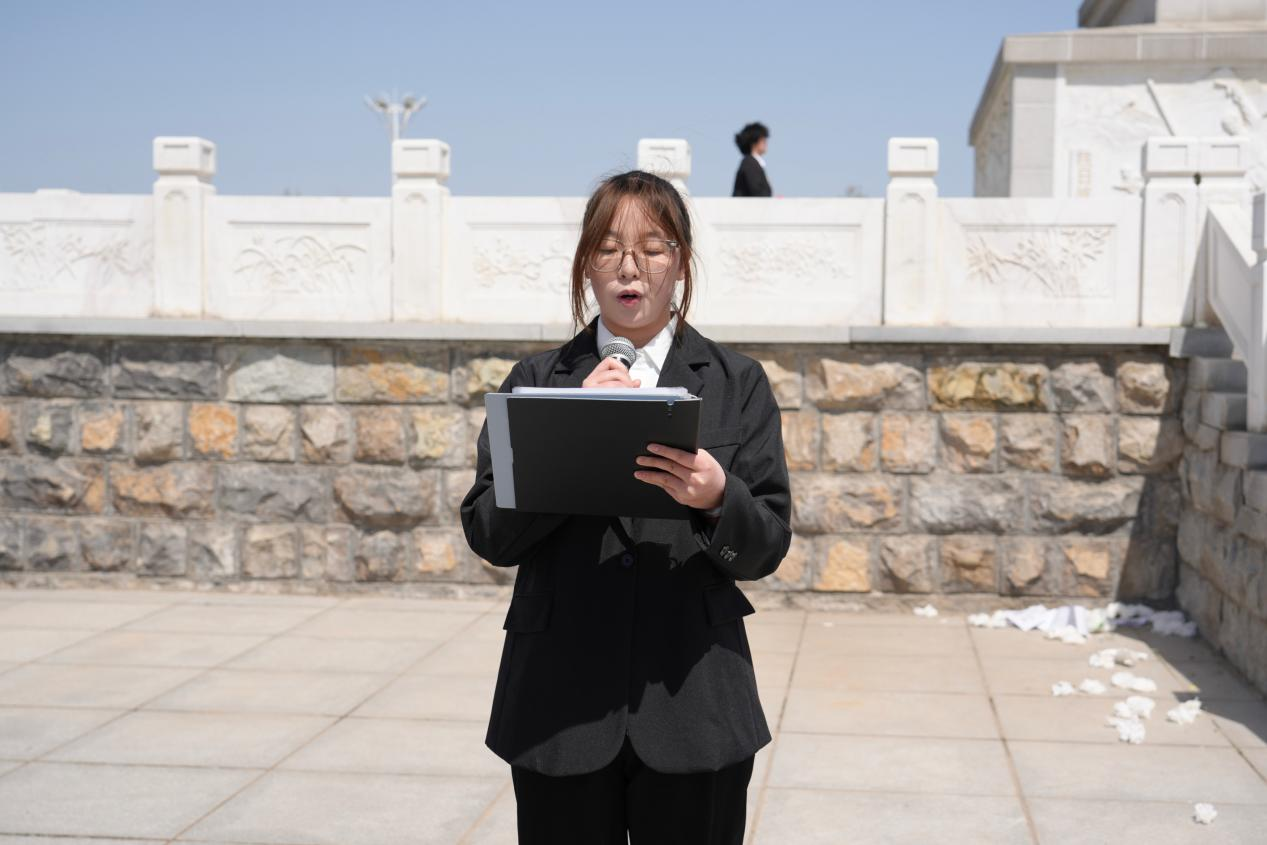 员工代表24级学前教育专业王玮琪致扫墓词,她言辞恳切,深切表达了对革命先烈的缅怀与崇敬。她表示,革命先烈的精神永垂不朽,新时代青年应赓续先烈遗志,以革命先烈艰苦奋斗、无私奉献的精神为指引,将个人理想融入中华民族伟大复兴的征程中,用实际行动践行“强国有我”的青春誓言!