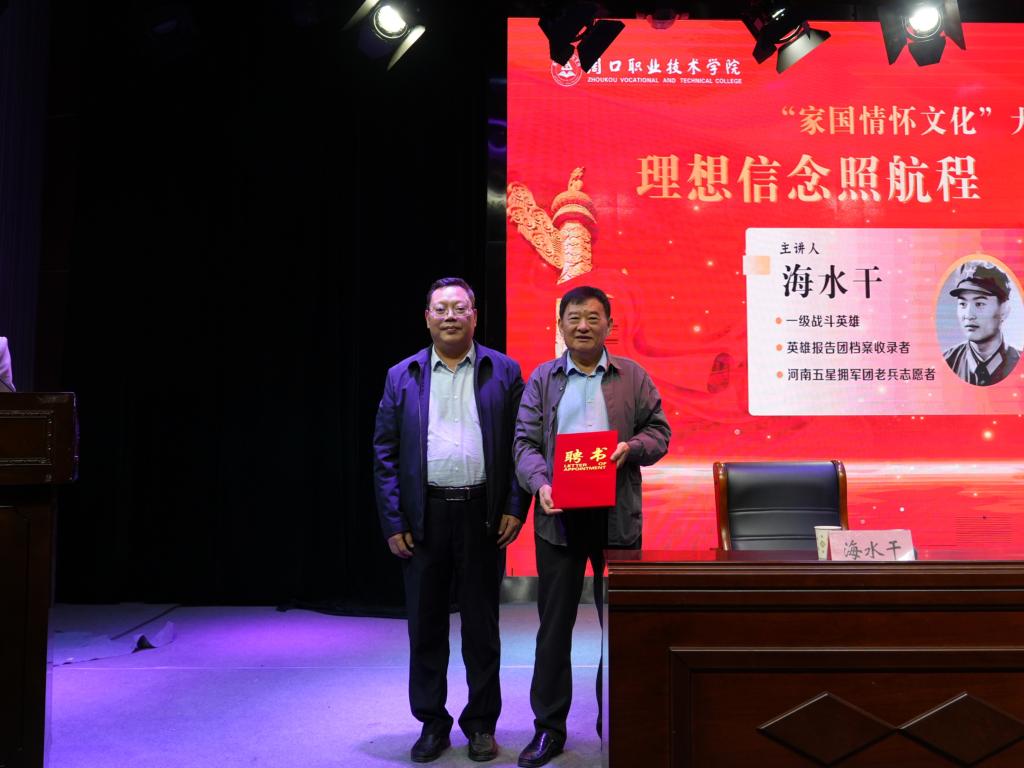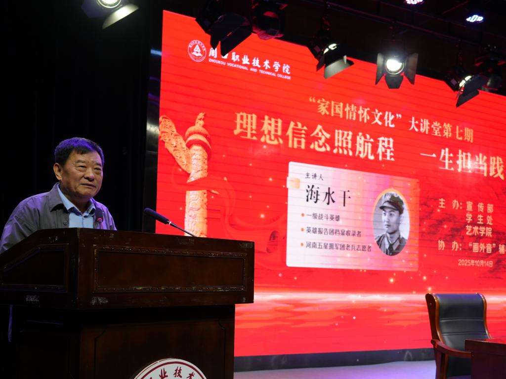 海水干同志围绕“理想信念照航程 一生担当践初心”主题,以亲身参与1979年对越自卫反击战老街战役的经历为引,回顾了那段烽火岁月中战士们舍生忘死的壮举,讲述了不为人知的英雄故事;他还分享自己退役后依旧坚守初心,积极投身于拥军与公益的感人事迹,生动诠释了中华儿女宁死不屈的英雄风骨与无私奉献的家国情怀。他勉励同学们从英雄事迹中汲取精神养分,将崇敬之心化作前行之力,努力成长为堪当民族复兴大任的时代新人。