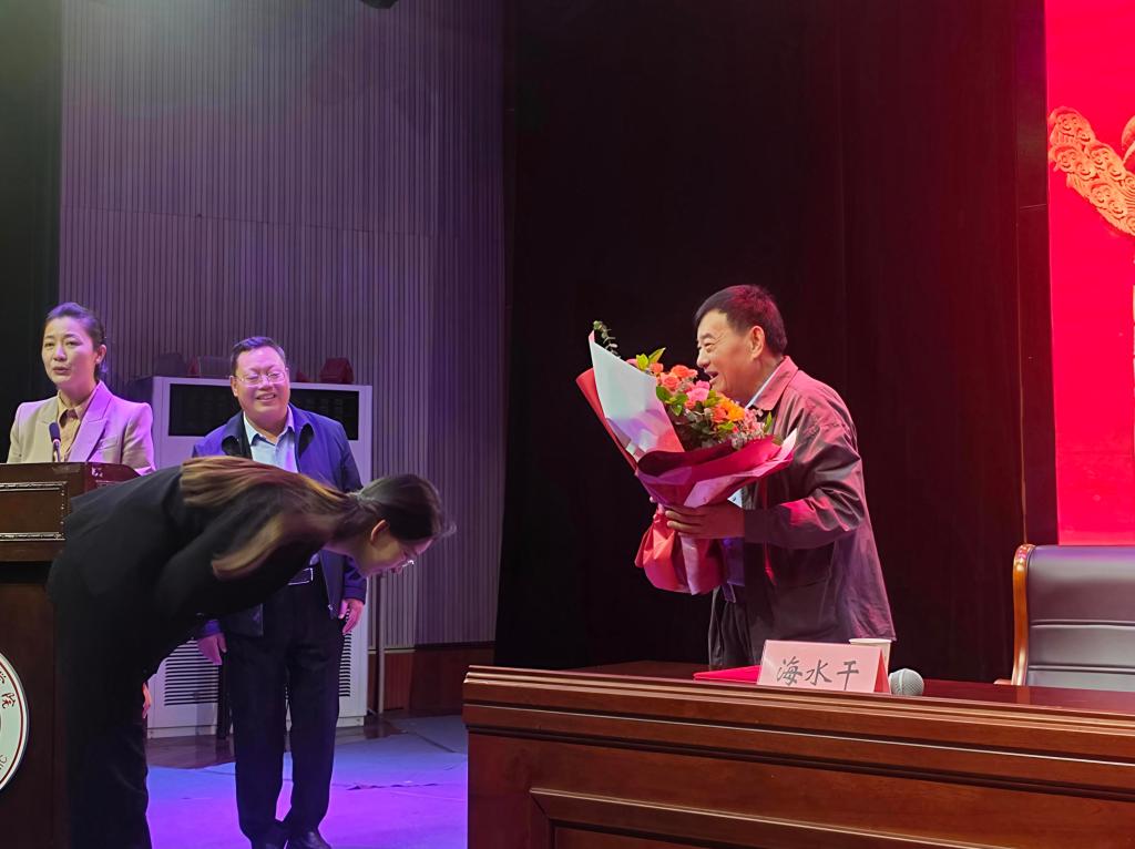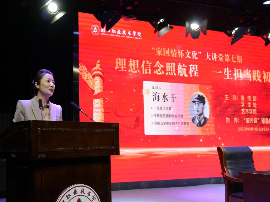 刘冬霞代表全体师生向海水干同志致以热烈欢迎与崇高敬意。她向同学们深情介绍了海老的英雄事迹,号召大家以英雄为榜样,汲取奋进力量,勇担时代重任。