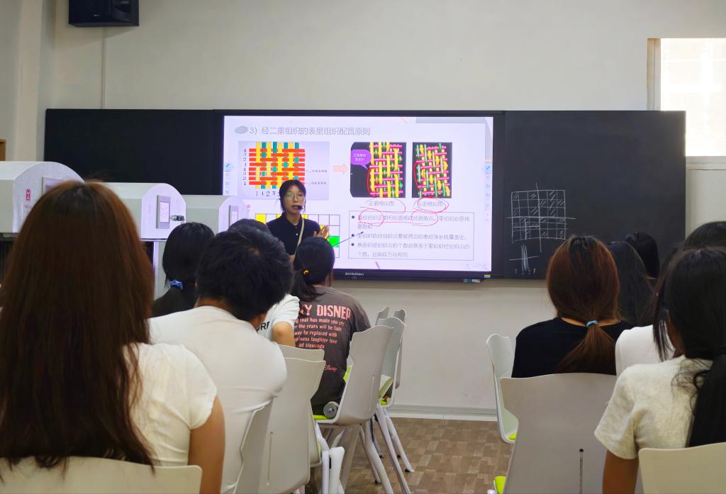 岳文丽老师进行《织物分析与小样试织》课程中“经二重组织”章节的授课。以生动有趣的案例导入课程,迅速吸引了员工的注意力。在教学过程中,运用多媒体课件展示相关图片和视频资料,详细讲解了组织结构等内容。